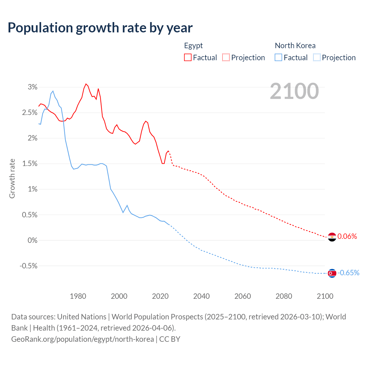 - For the last 10 years, Egypt has had an average growth rate of +1.84% per year vs +0.41% in North Korea.