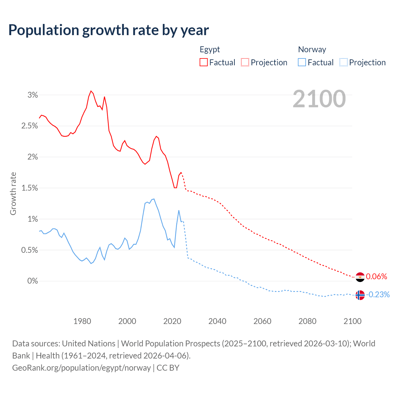 - For the last 10 years, Egypt has had an average growth rate of +1.84% per year vs +0.85% in Norway.