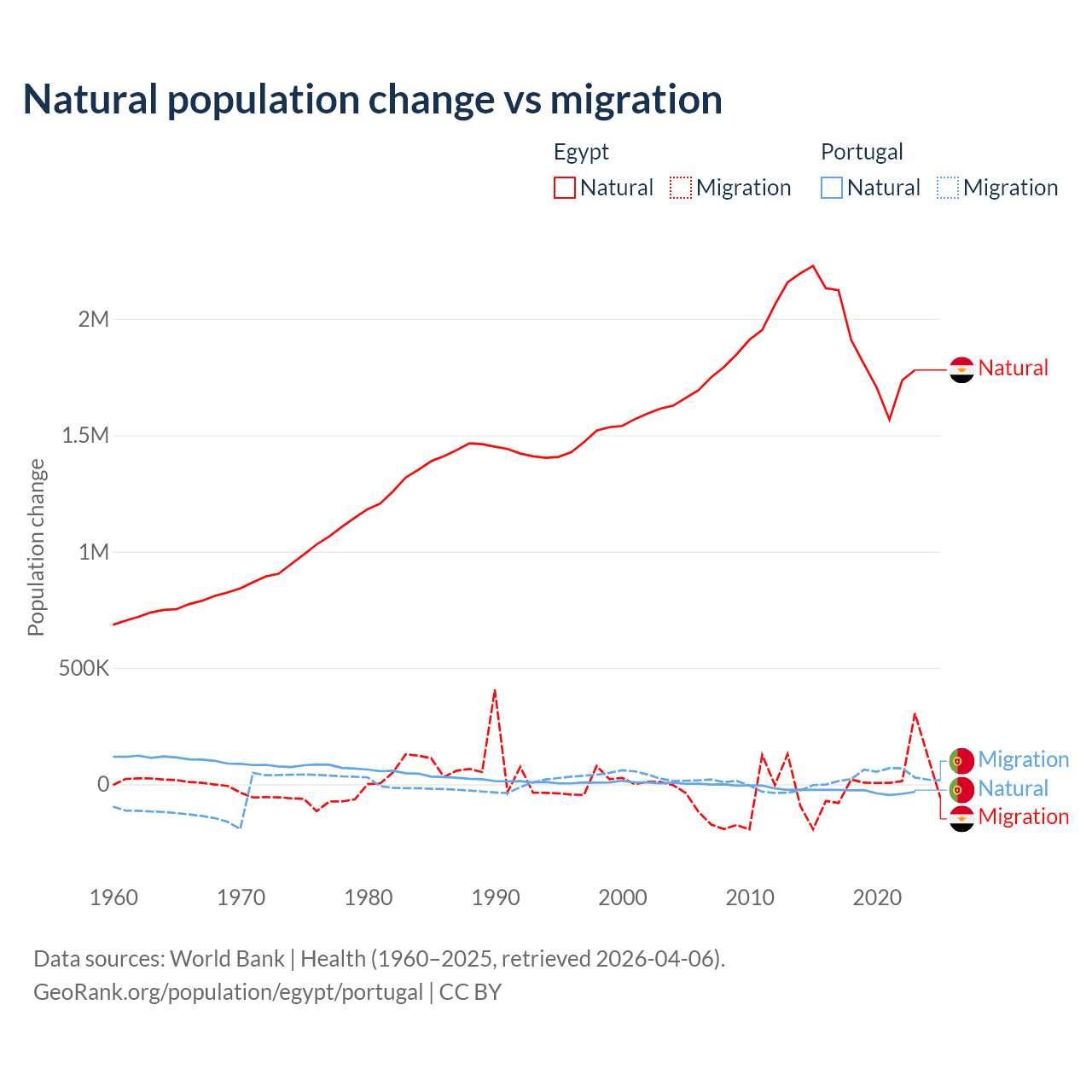 Over the last 10 years, 99.6% of the population change in Egypt is from natural causes (a gain of 19,180,073 people) and 0.41% is from migration (a loss of 78,975 people). In Portugal 51% is from natural causes (a loss of 302,748 people) and 49% is from migration (a gain of 290,554 people).