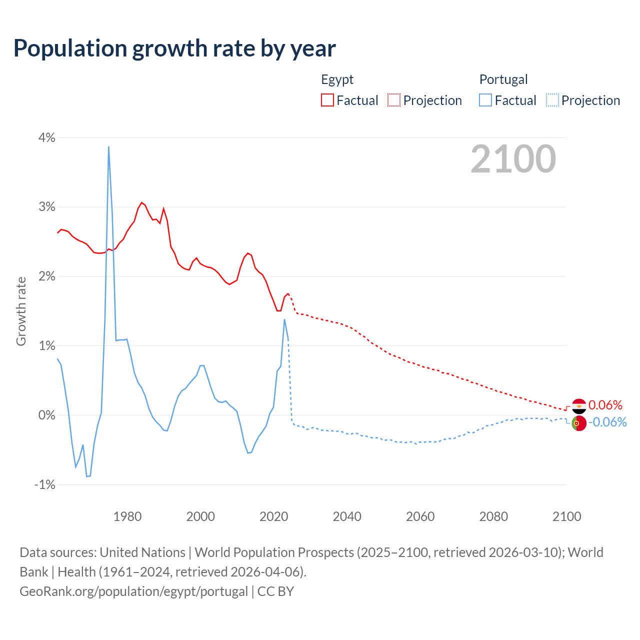 - For the last 10 years, Egypt has had an average growth rate of +1.84% per year vs +0.21% in Portugal.