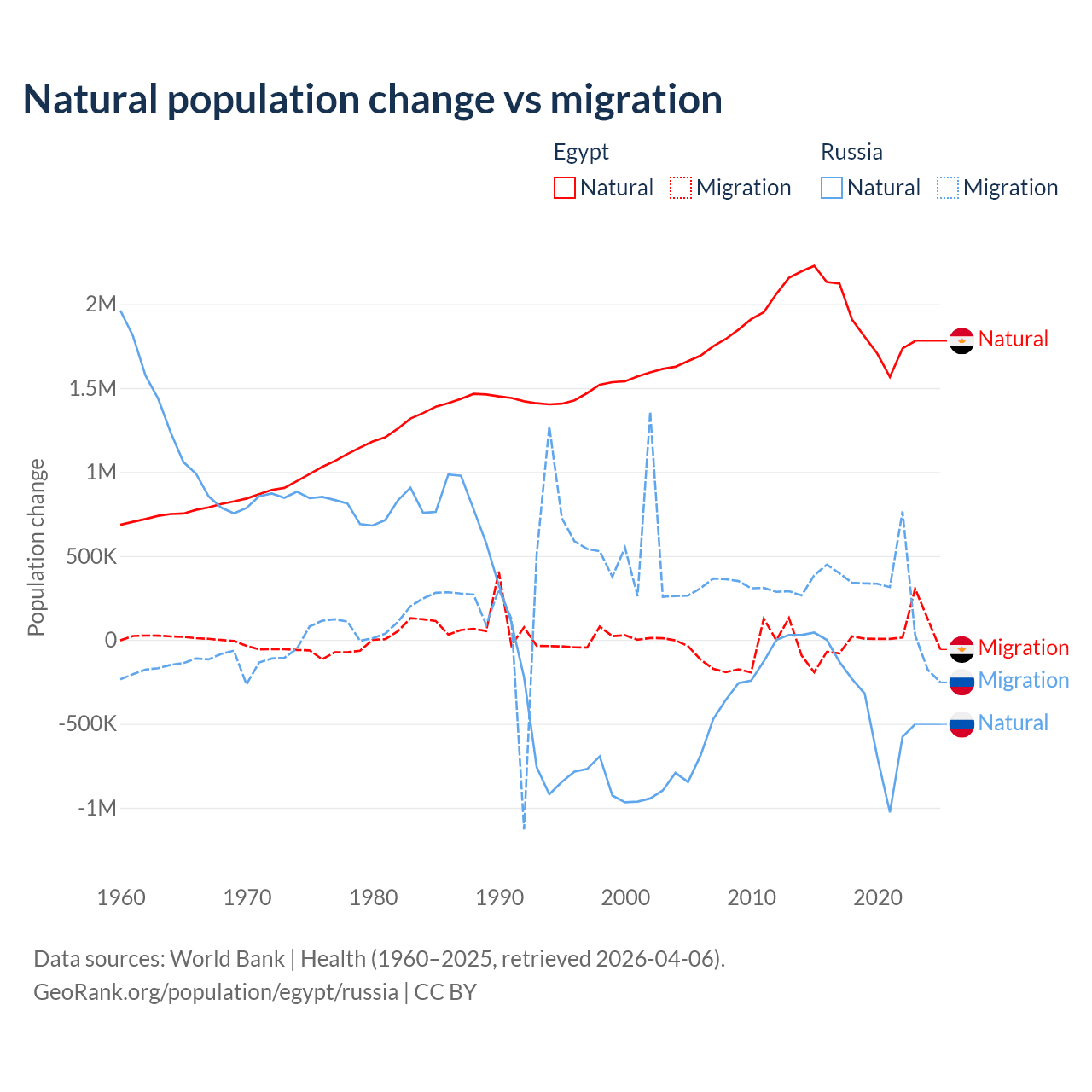 Over the last 10 years, 99.6% of the population change in Egypt is from natural causes (a gain of 19,180,073 people) and 0.41% is from migration (a loss of 78,975 people). In Russia 48.6% is from natural causes (a loss of 3,416,377 people) and 51.4% is from migration (a gain of 3,611,826 people).