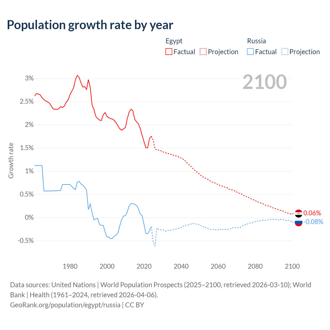 - For the last 10 years, Egypt has had an average growth rate of +1.84% per year vs -0.02% in Russia.