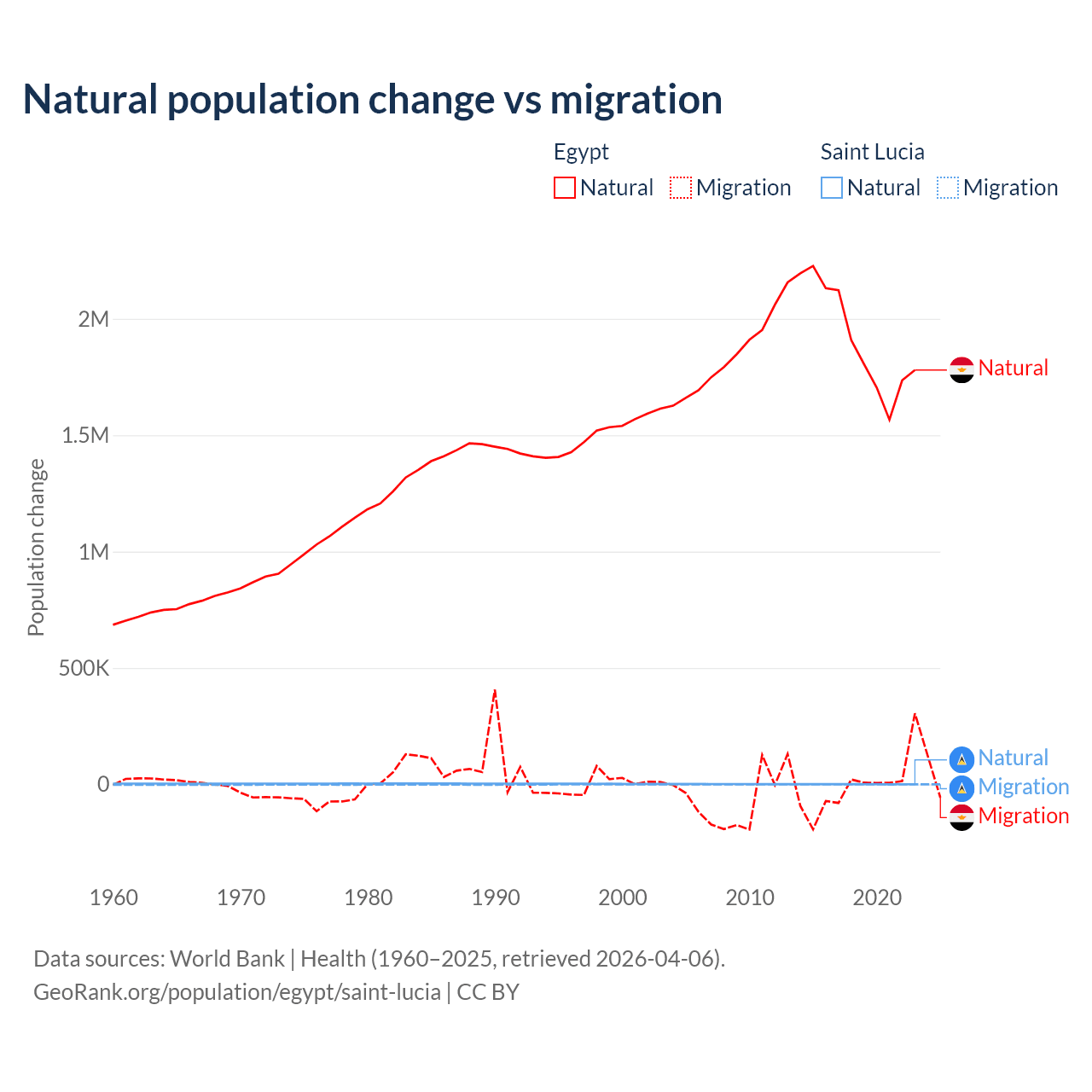 Over the last 10 years, 99.6% of the population change in Egypt is from natural causes (a gain of 19,180,073 people) and 0.41% is from migration (a loss of 78,975 people). In Saint Lucia 95.7% is from natural causes (a gain of 6,039 people) and 4.31% is from migration (a loss of 272 people).