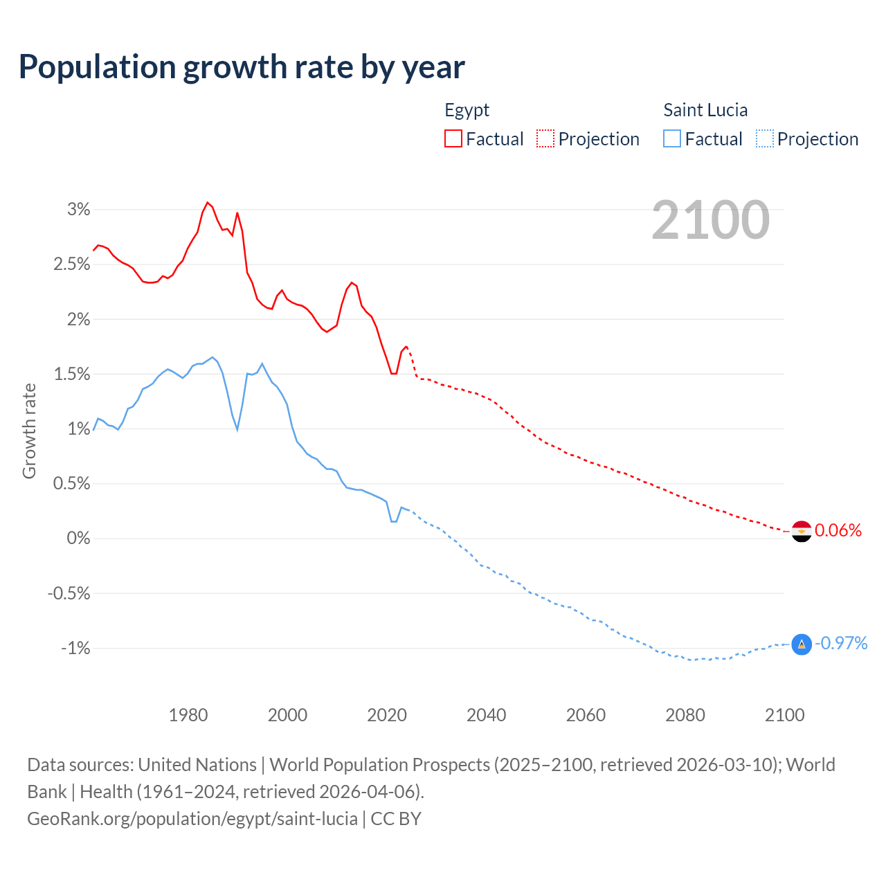 - For the last 10 years, Egypt has had an average growth rate of +1.84% per year vs +0.33% in Saint Lucia.