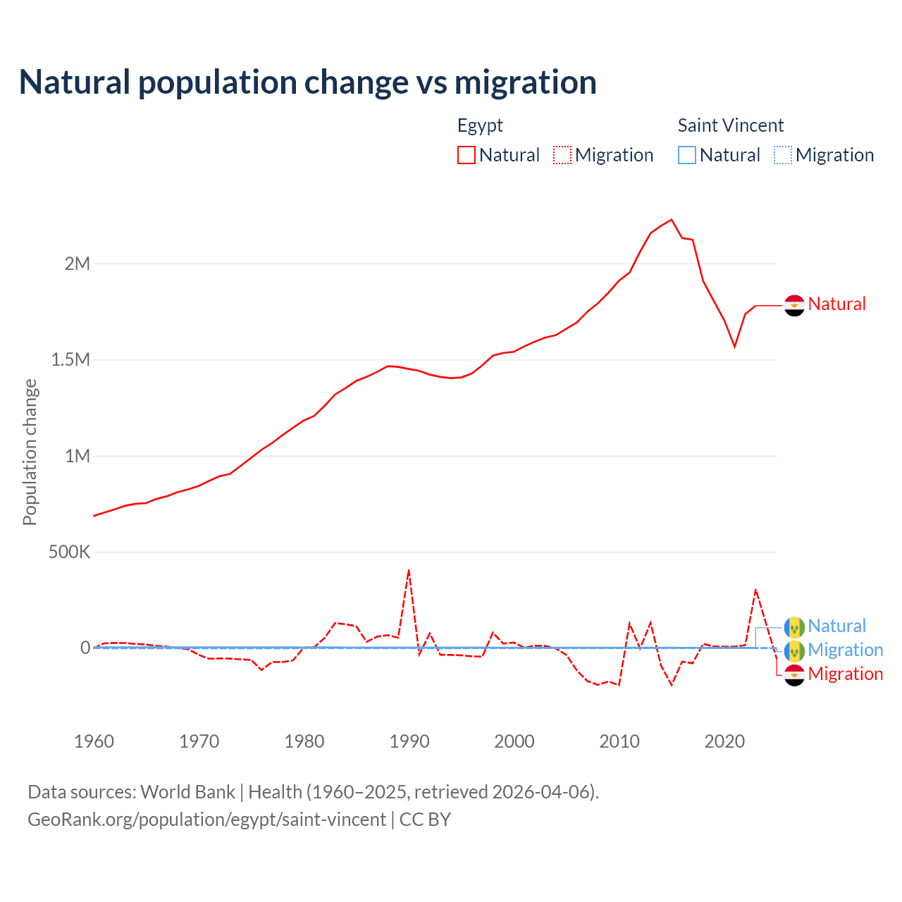 Over the last 10 years, 99.6% of the population change in Egypt is from natural causes (a gain of 19,180,073 people) and 0.41% is from migration (a loss of 78,975 people). In Saint Vincent 21.2% is from natural causes (a gain of 2,525 people) and 78.8% is from migration (a loss of 9,393 people).