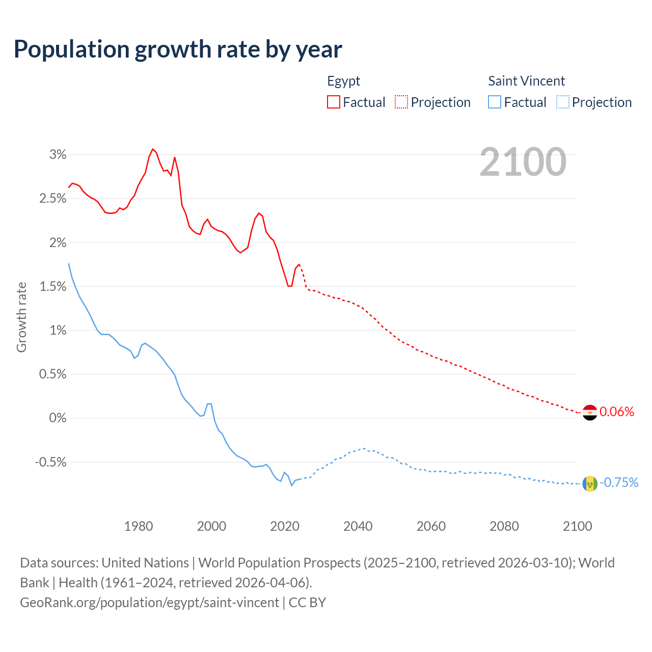 - For the last 10 years, Egypt has had an average growth rate of +1.84% per year vs -0.65% in Saint Vincent.