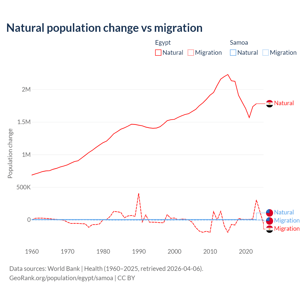 Over the last 10 years, 99.6% of the population change in Egypt is from natural causes (a gain of 19,180,073 people) and 0.41% is from migration (a loss of 78,975 people). In Samoa 62.5% is from natural causes (a gain of 45,436 people) and 37.5% is from migration (a loss of 27,246 people).