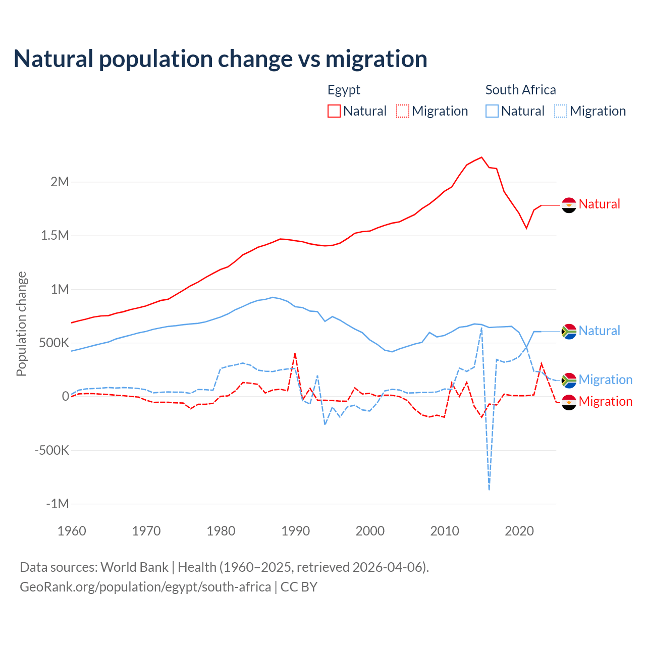 Over the last 10 years, 99.6% of the population change in Egypt is from natural causes (a gain of 19,180,073 people) and 0.41% is from migration (a loss of 78,975 people). In South Africa 72.8% is from natural causes (a gain of 6,190,027 people) and 27.2% is from migration (a gain of 2,316,795 people).