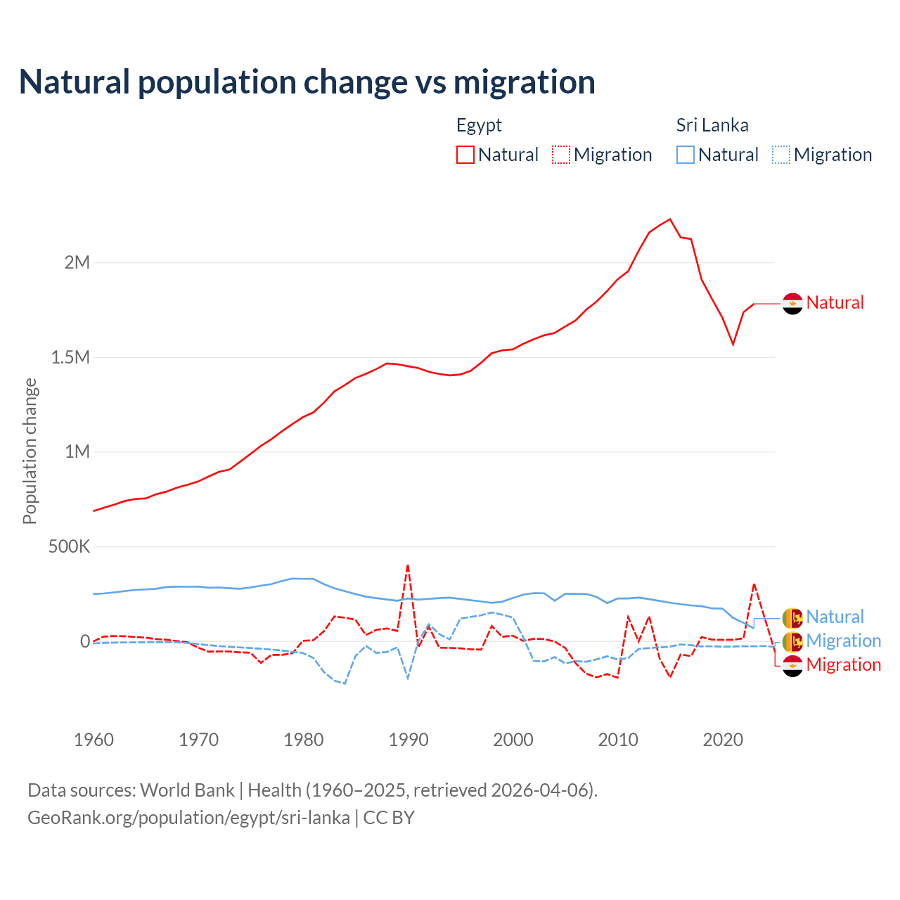 Over the last 10 years, 99.6% of the population change in Egypt is from natural causes (a gain of 19,180,073 people) and 0.41% is from migration (a loss of 78,975 people). In Sri Lanka 85.3% is from natural causes (a gain of 1,605,749 people) and 14.7% is from migration (a loss of 276,121 people).