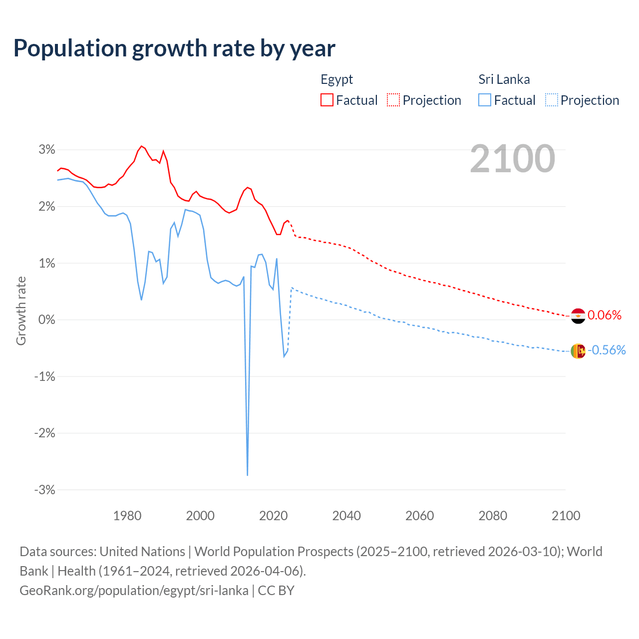 - For the last 10 years, Egypt has had an average growth rate of +1.84% per year vs +0.57% in Sri Lanka.