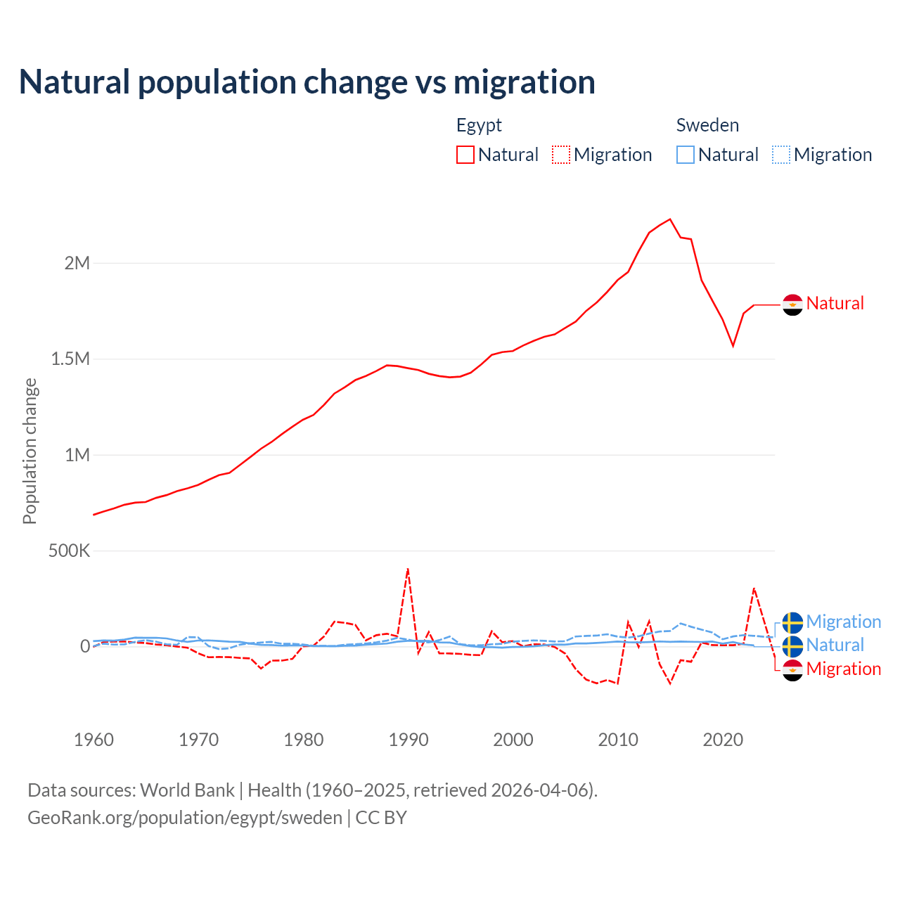 Over the last 10 years, 99.6% of the population change in Egypt is from natural causes (a gain of 19,180,073 people) and 0.41% is from migration (a loss of 78,975 people). In Sweden 21.4% is from natural causes (a gain of 201,900 people) and 78.6% is from migration (a gain of 743,642 people).