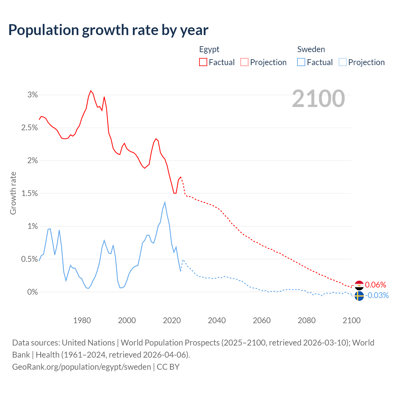 - For the last 10 years, Egypt has had an average growth rate of +1.84% per year vs +0.88% in Sweden.