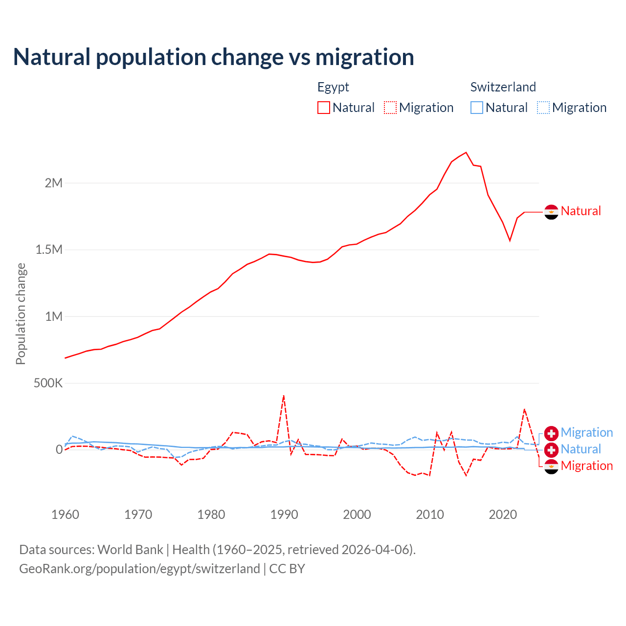 Over the last 10 years, 99.6% of the population change in Egypt is from natural causes (a gain of 19,180,073 people) and 0.41% is from migration (a loss of 78,975 people). In Switzerland 21.6% is from natural causes (a gain of 165,354 people) and 78.4% is from migration (a gain of 600,145 people).