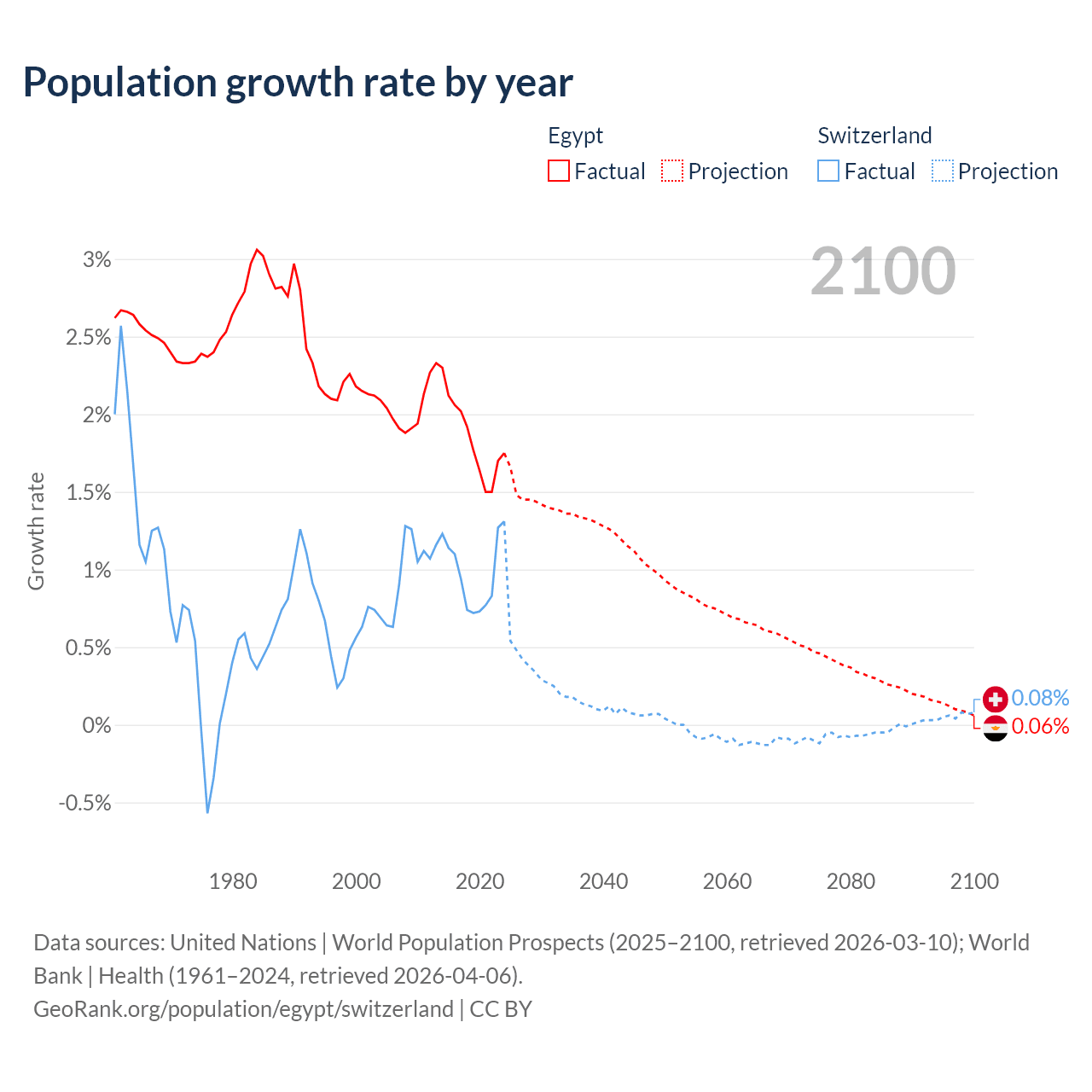 - For the last 10 years, Egypt has had an average growth rate of +1.84% per year vs +0.98% in Switzerland.