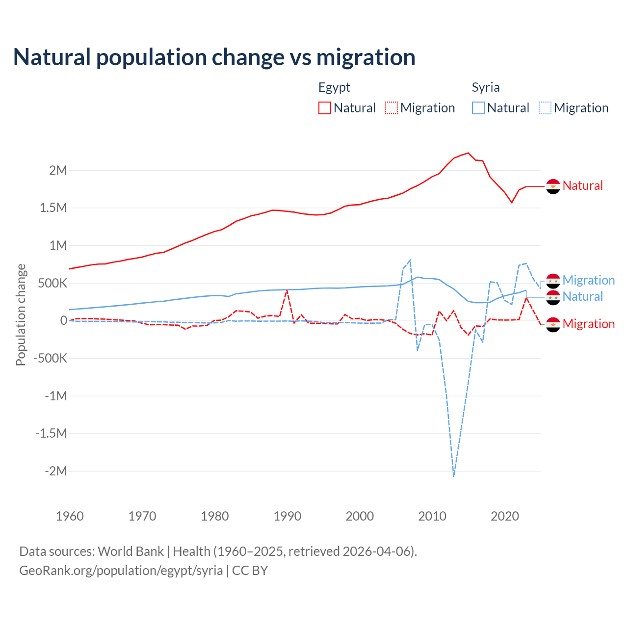 Over the last 10 years, 99.6% of the population change in Egypt is from natural causes (a gain of 19,180,073 people) and 0.41% is from migration (a loss of 78,975 people). In Syria 91.3% is from natural causes (a gain of 3,047,621 people) and 8.72% is from migration (a gain of 291,069 people).