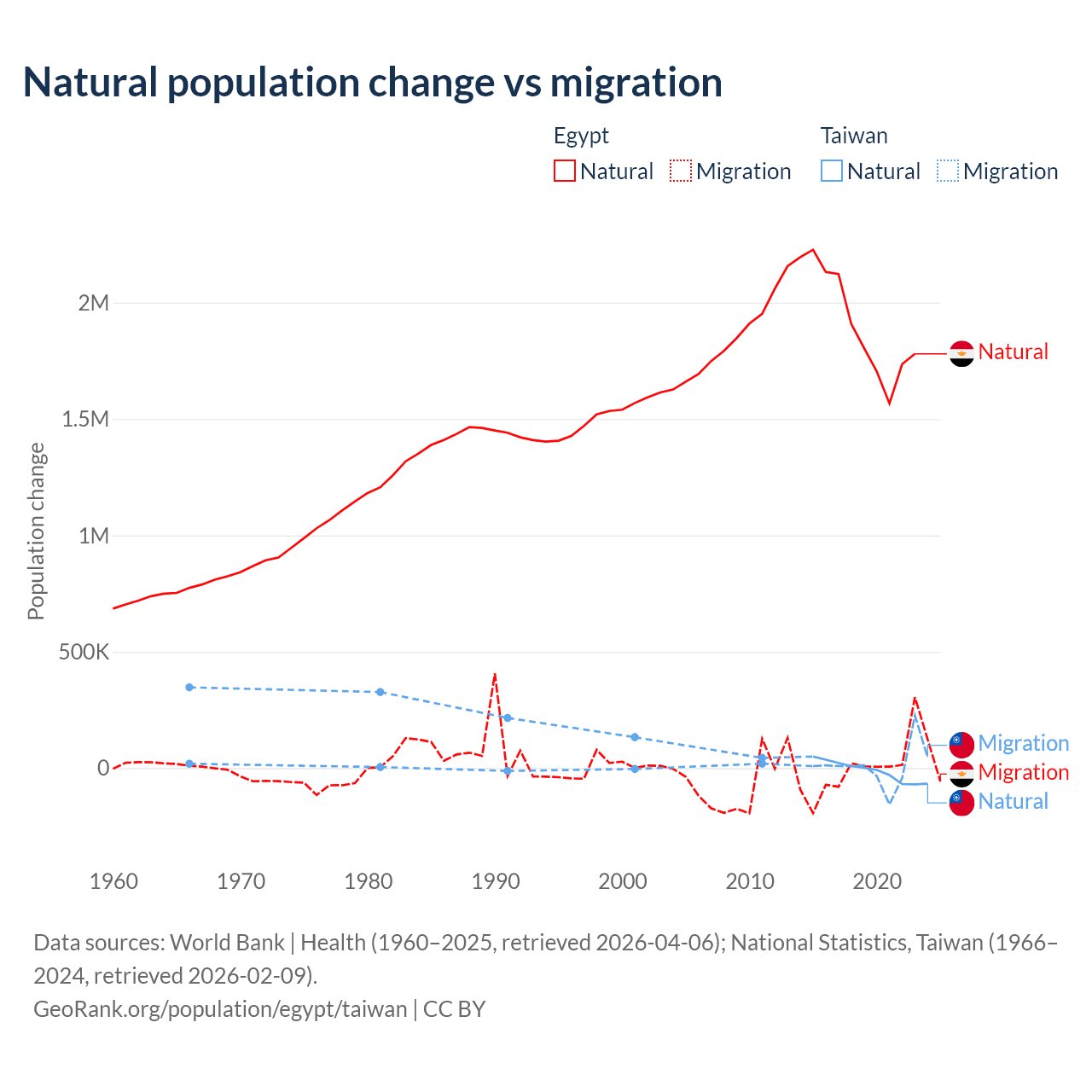 Over the last 10 years, 99.6% of the population change in Egypt is from natural causes (a gain of 19,180,073 people) and 0.41% is from migration (a loss of 78,975 people). In Taiwan 56.7% is from natural causes (a loss of 57,467 people) and 43.3% is from migration (a gain of 43,884 people).