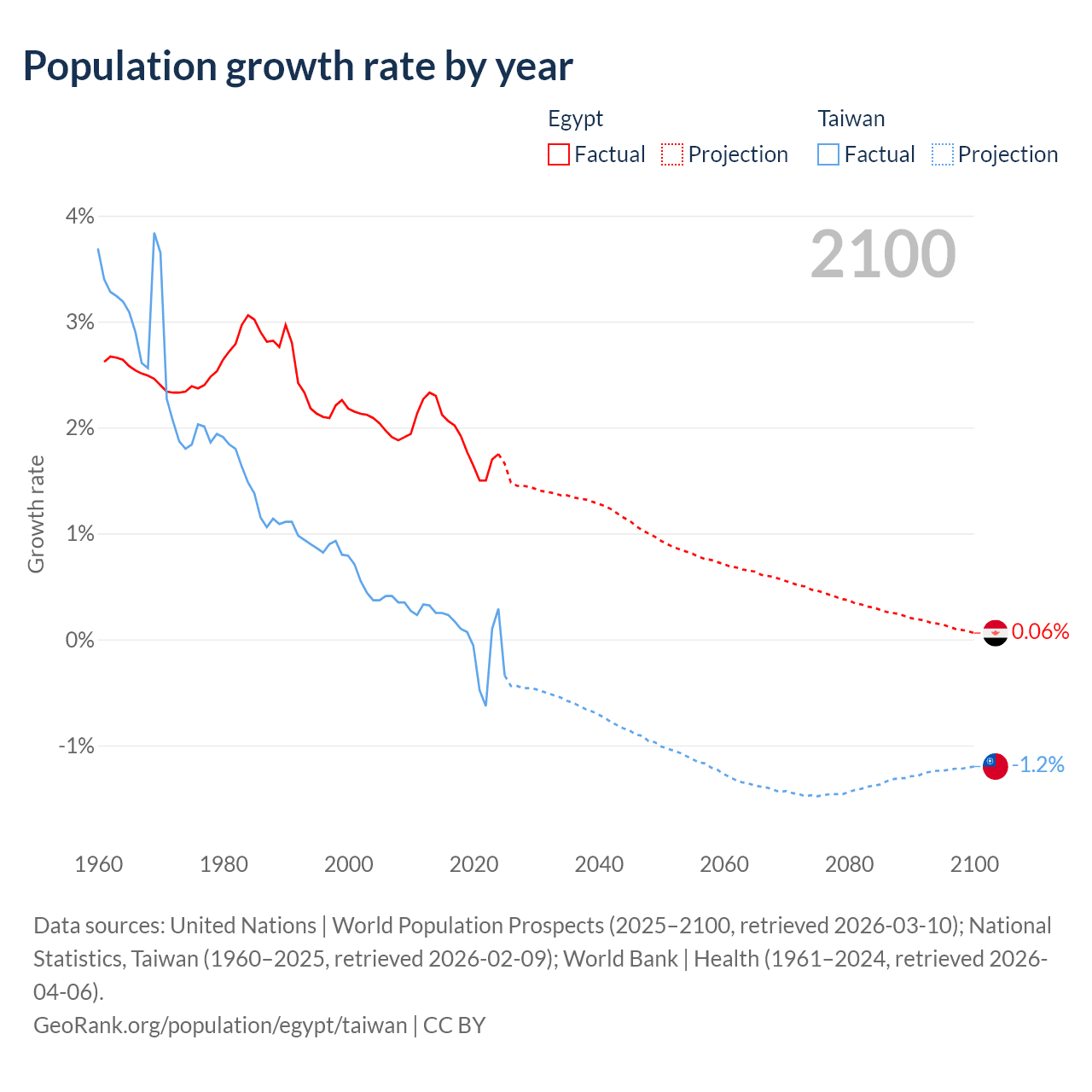 - For the last 10 years, Egypt has had an average growth rate of +1.84% per year vs -0.03% in Taiwan.