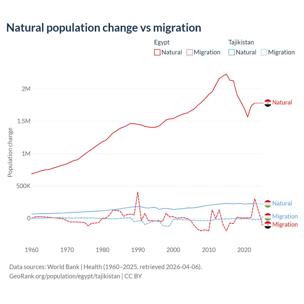 Over the last 10 years, 99.6% of the population change in Egypt is from natural causes (a gain of 19,180,073 people) and 0.41% is from migration (a loss of 78,975 people). In Tajikistan 96% is from natural causes (a gain of 2,266,045 people) and 3.95% is from migration (a loss of 93,205 people).