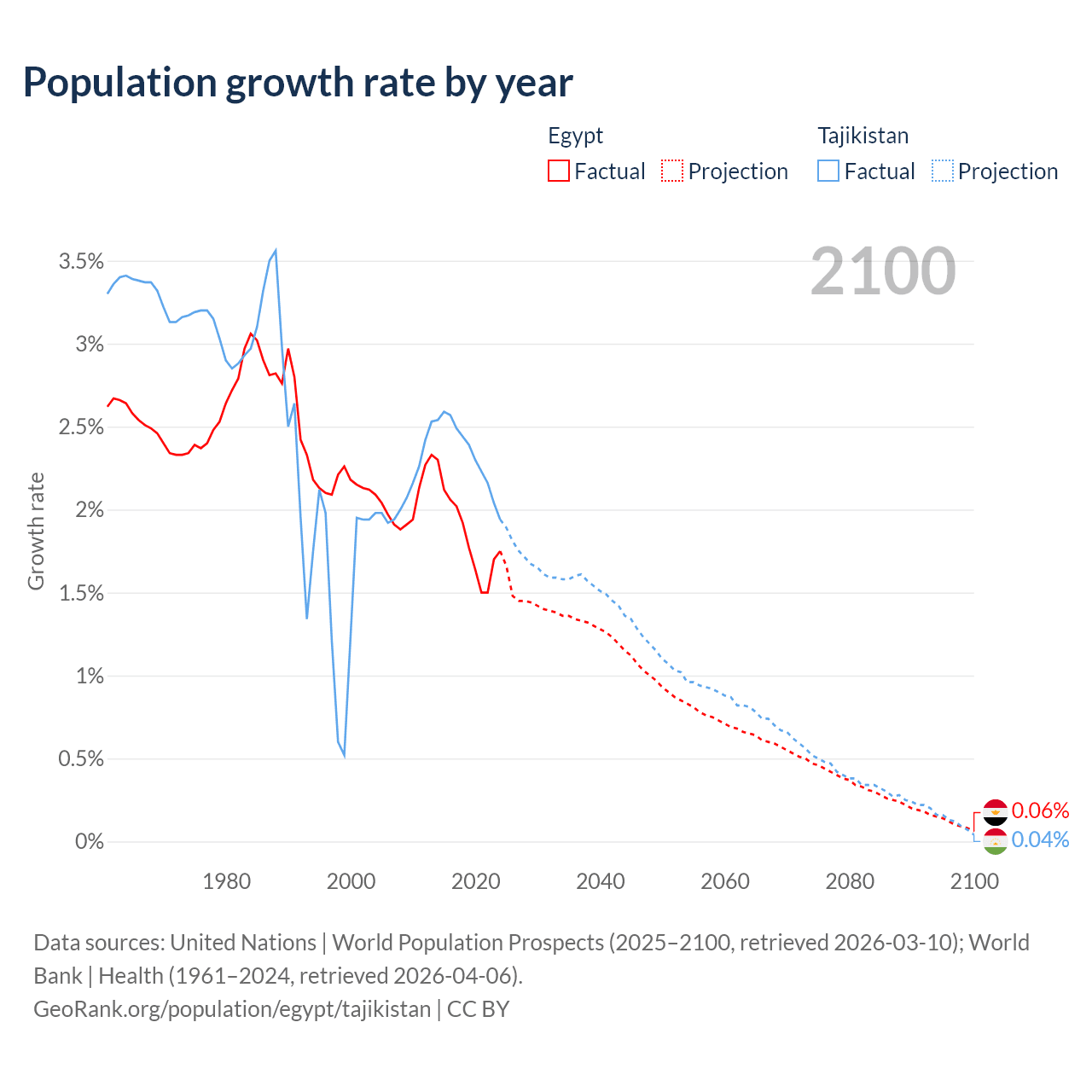 - For the last 10 years, Egypt has had an average growth rate of +1.84% per year vs +2.33% in Tajikistan.