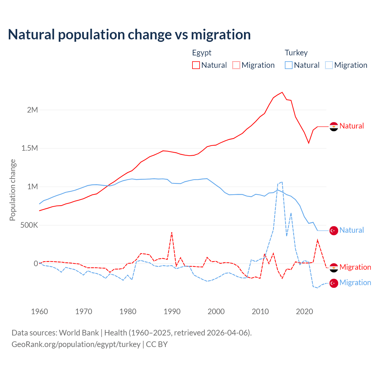 Over the last 10 years, 99.6% of the population change in Egypt is from natural causes (a gain of 19,180,073 people) and 0.41% is from migration (a loss of 78,975 people). In Turkey 73% is from natural causes (a gain of 7,333,352 people) and 27% is from migration (a gain of 2,718,916 people).