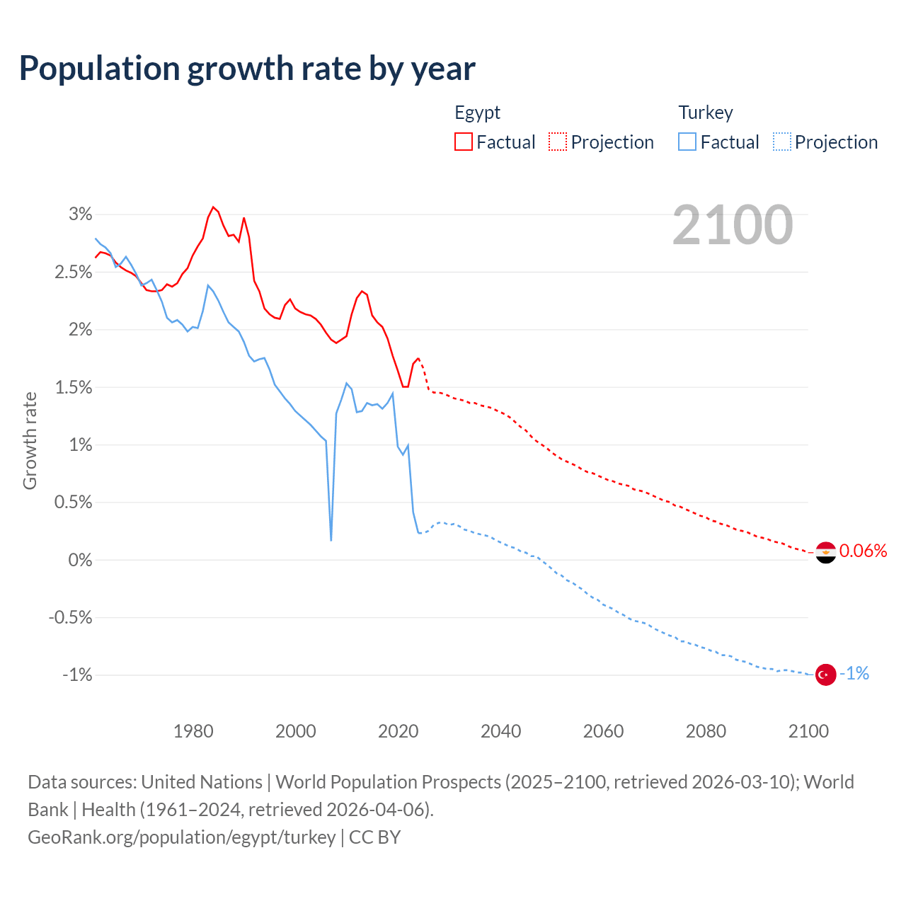 - For the last 10 years, Egypt has had an average growth rate of +1.84% per year vs +1.06% in Turkey.