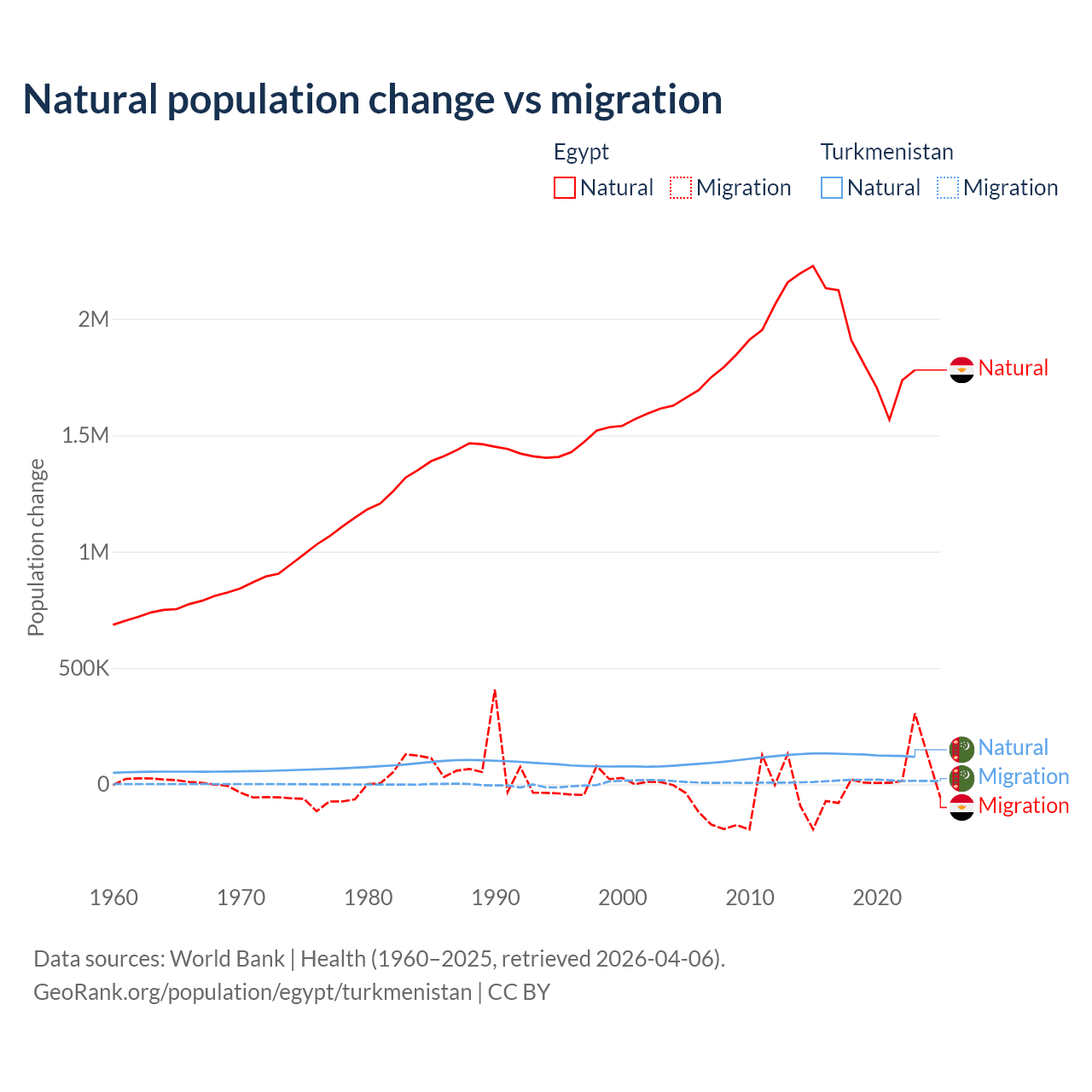 Over the last 10 years, 99.6% of the population change in Egypt is from natural causes (a gain of 19,180,073 people) and 0.41% is from migration (a loss of 78,975 people). In Turkmenistan 89.2% is from natural causes (a gain of 1,270,228 people) and 10.8% is from migration (a gain of 154,379 people).
