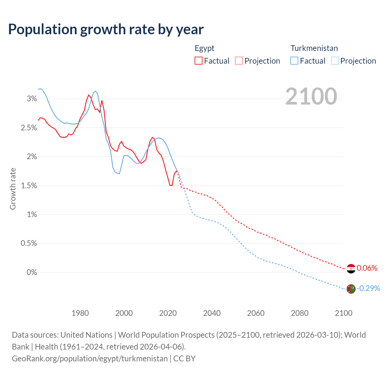 - For the last 10 years, Egypt has had an average growth rate of +1.84% per year vs +2.14% in Turkmenistan.