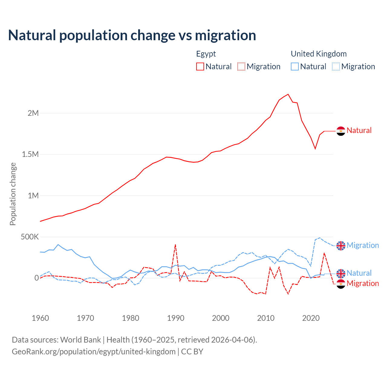 Over the last 10 years, 99.6% of the population change in Egypt is from natural causes (a gain of 19,180,073 people) and 0.41% is from migration (a loss of 78,975 people). In the United Kingdom 23.9% is from natural causes (a gain of 1,033,129 people) and 76.1% is from migration (a gain of 3,283,101 people).