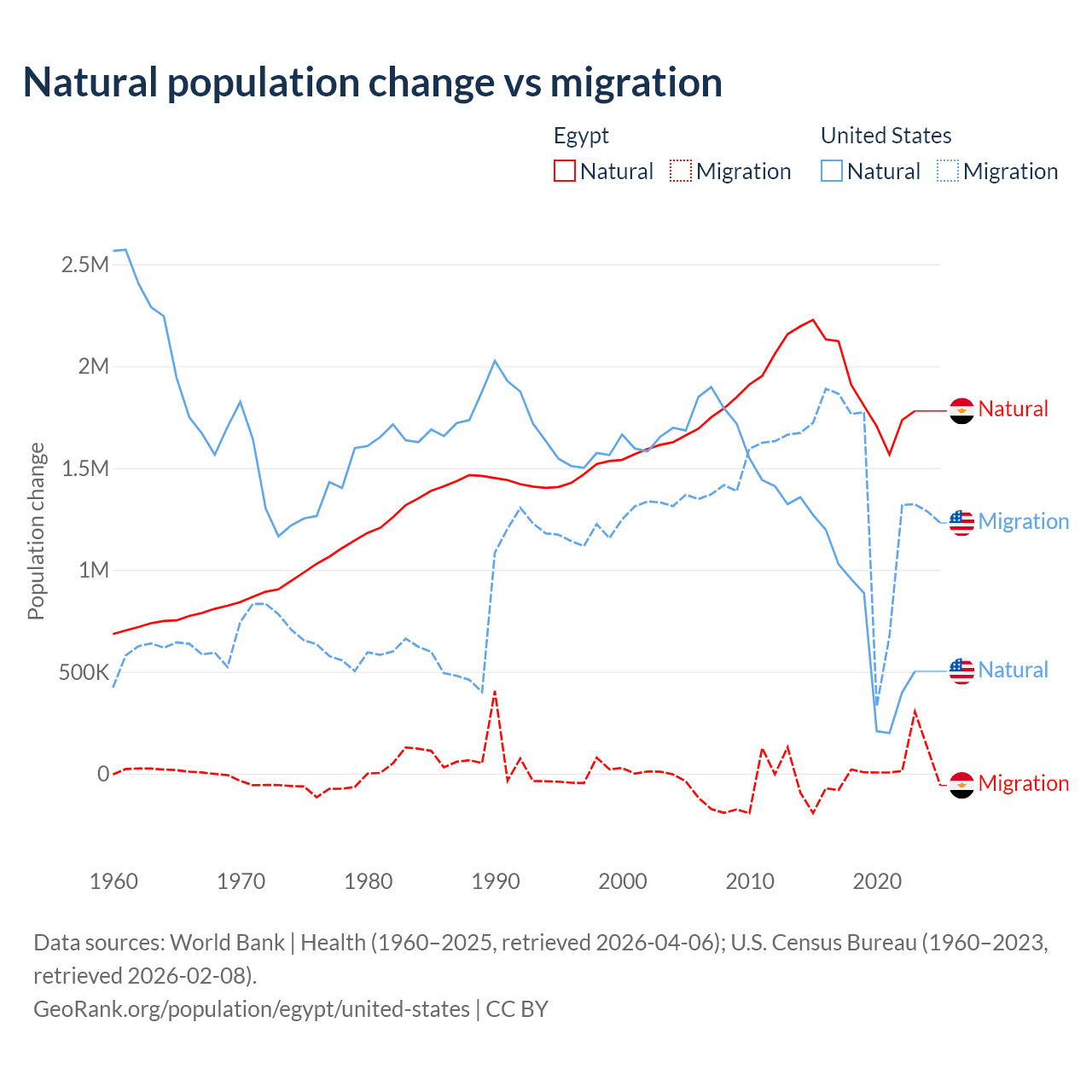 Over the last 10 years, 99.6% of the population change in Egypt is from natural causes (a gain of 19,180,073 people) and 0.41% is from migration (a loss of 78,975 people). In the United States 35.8% is from natural causes (a gain of 8,005,866 people) and 64.2% is from migration (a gain of 14,334,286 people).