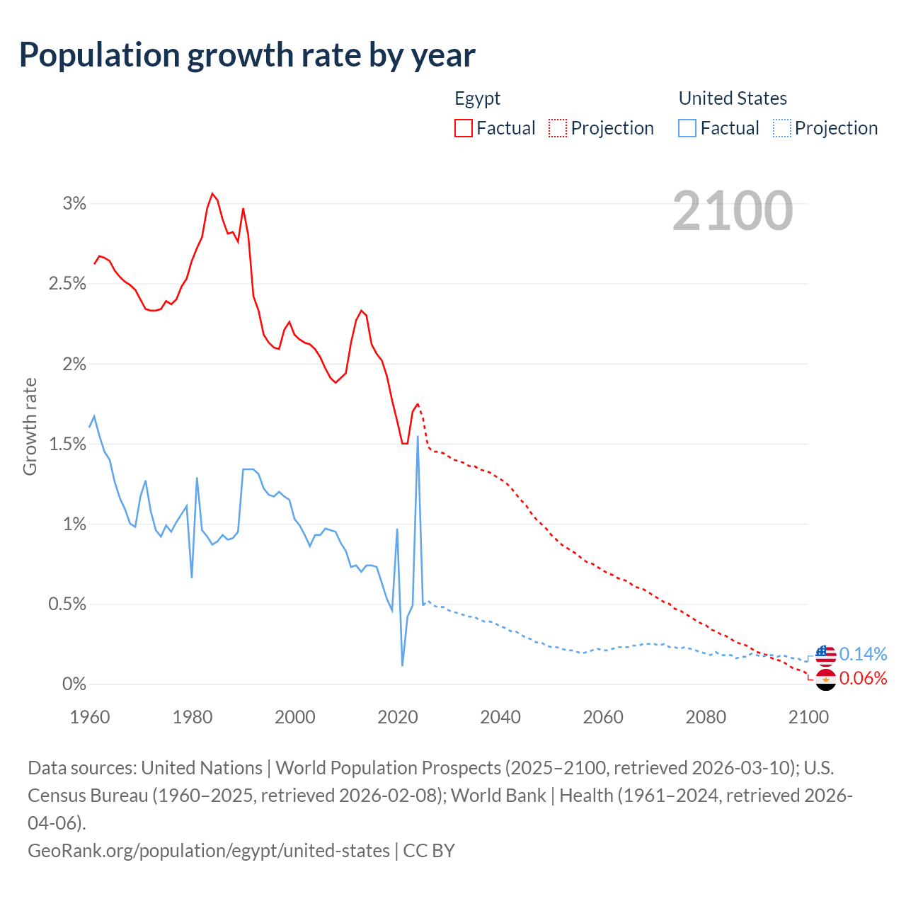 - For the last 10 years, Egypt has had an average growth rate of +1.84% per year vs +0.65% in the United States.