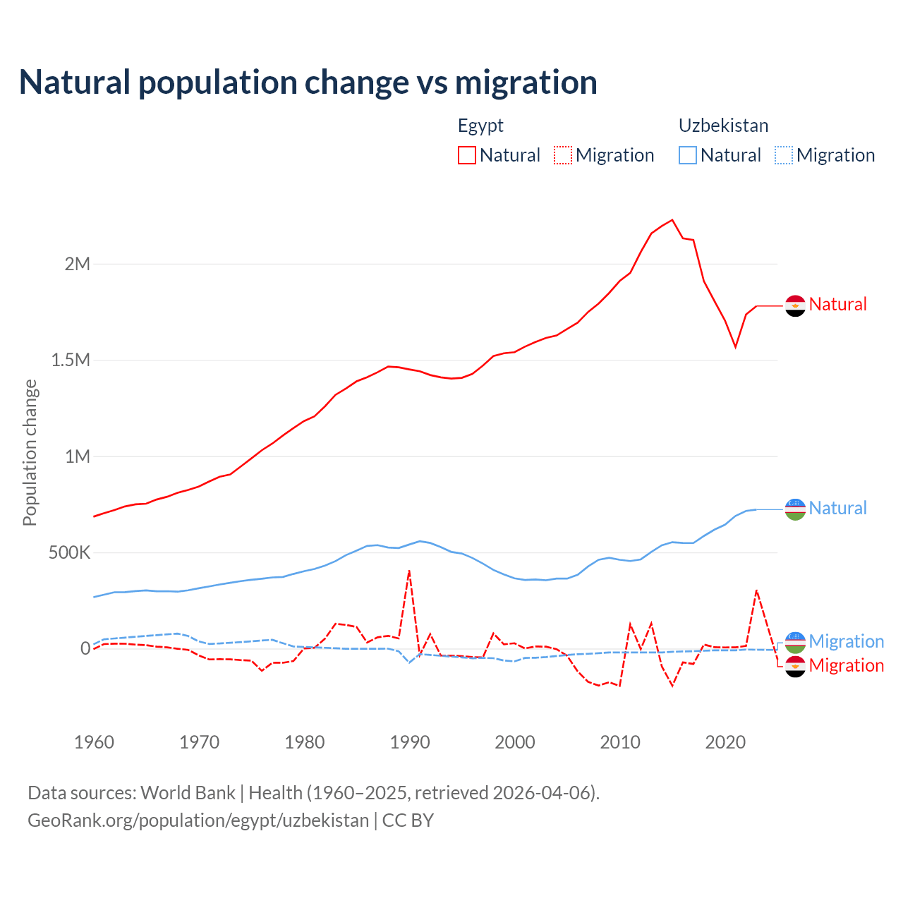 Over the last 10 years, 99.6% of the population change in Egypt is from natural causes (a gain of 19,180,073 people) and 0.41% is from migration (a loss of 78,975 people). In Uzbekistan 98.2% is from natural causes (a gain of 6,161,117 people) and 1.84% is from migration (a loss of 115,398 people).