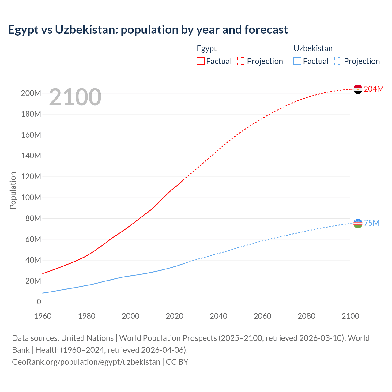 The latest officially reported population of Egypt was 116,538,258 in 2024 vs 36,361,859 people in Uzbekistan in 2024. In 2026, based on the adjusted UN estimation, the current Egypt's population is 120,697,176 people compared to 37,939,105 in Uzbekistan.