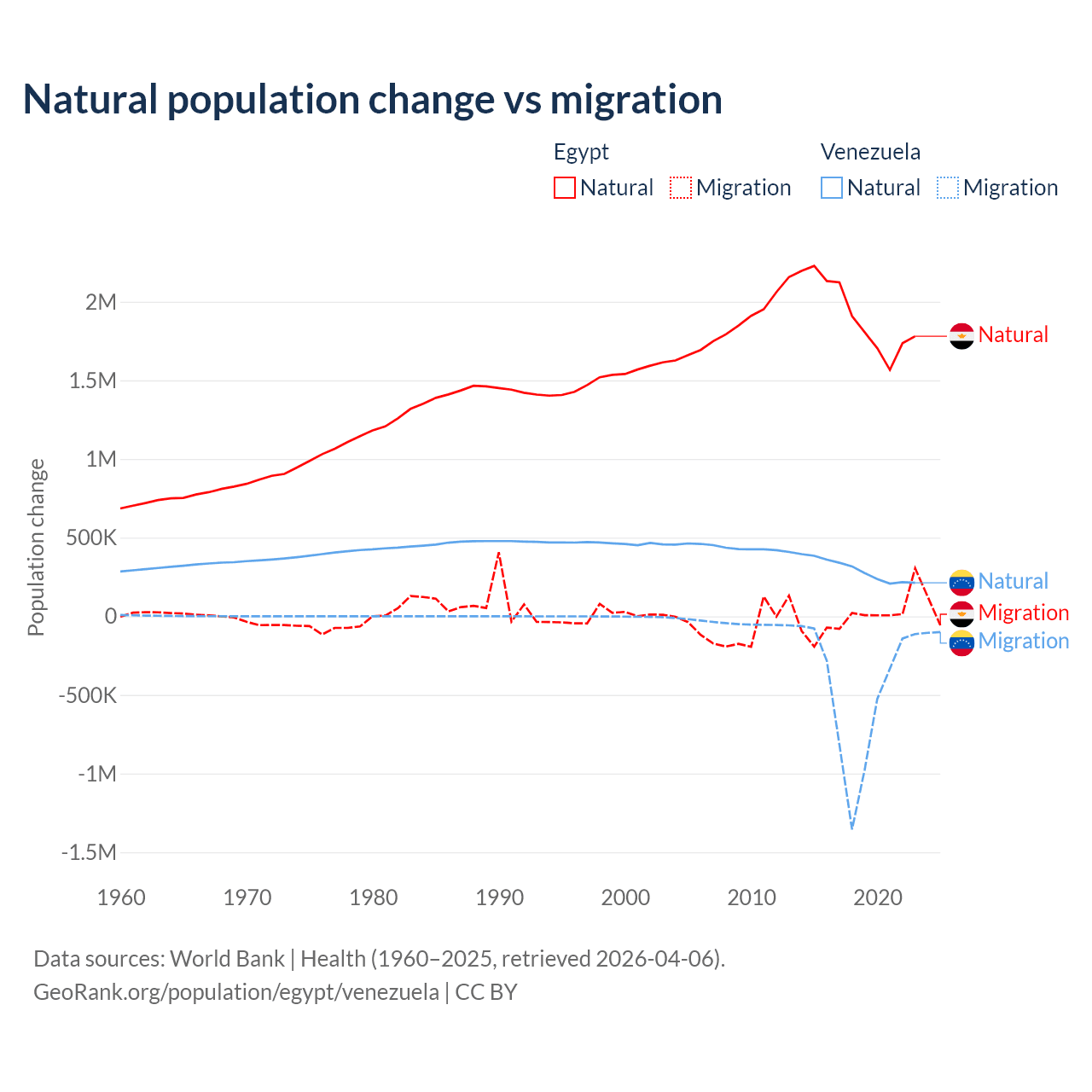 Over the last 10 years, 99.6% of the population change in Egypt is from natural causes (a gain of 19,180,073 people) and 0.41% is from migration (a loss of 78,975 people). In Venezuela 38.6% is from natural causes (a gain of 2,946,257 people) and 61.4% is from migration (a loss of 4,683,227 people).