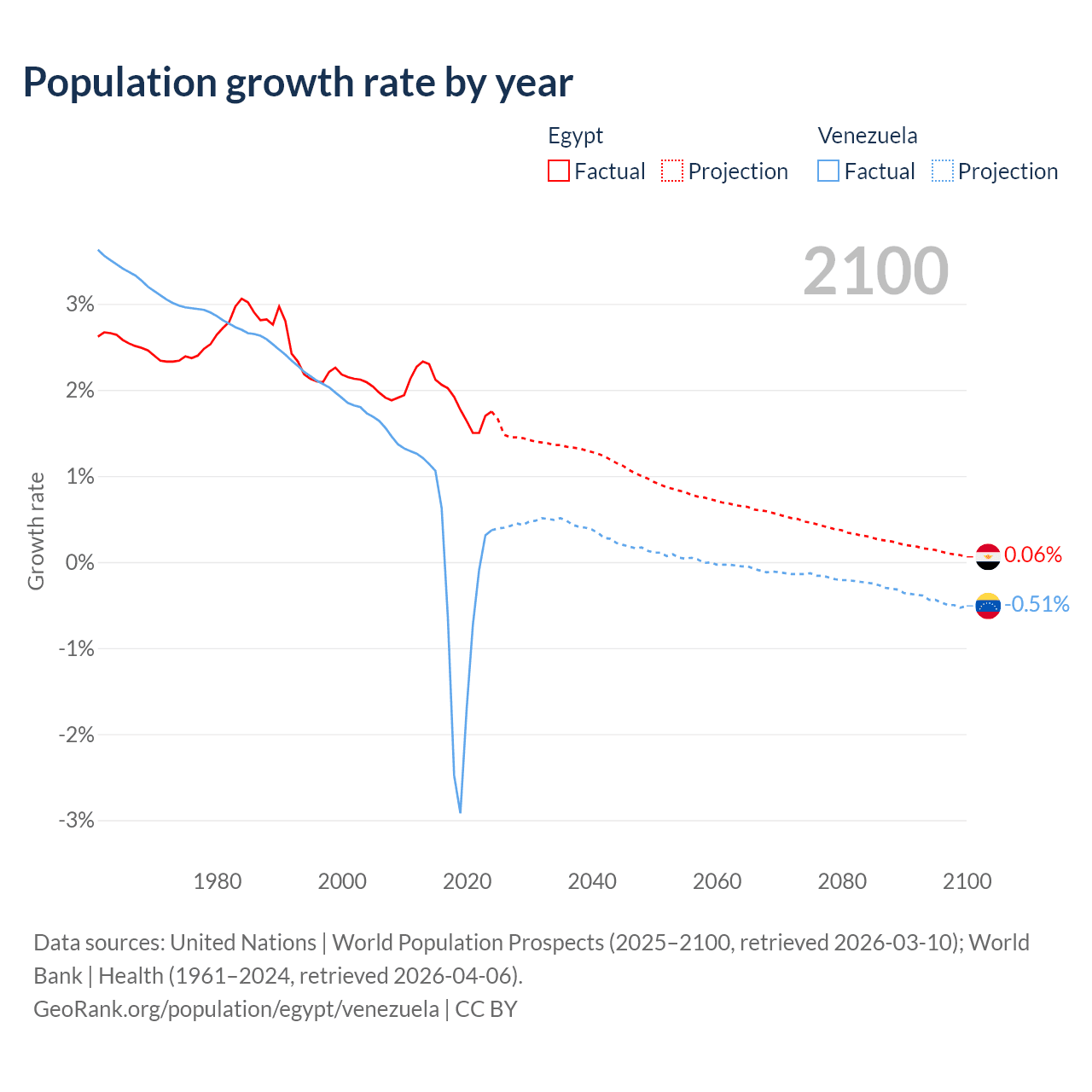 - For the last 10 years, Egypt has had an average growth rate of +1.84% per year vs -0.46% in Venezuela.