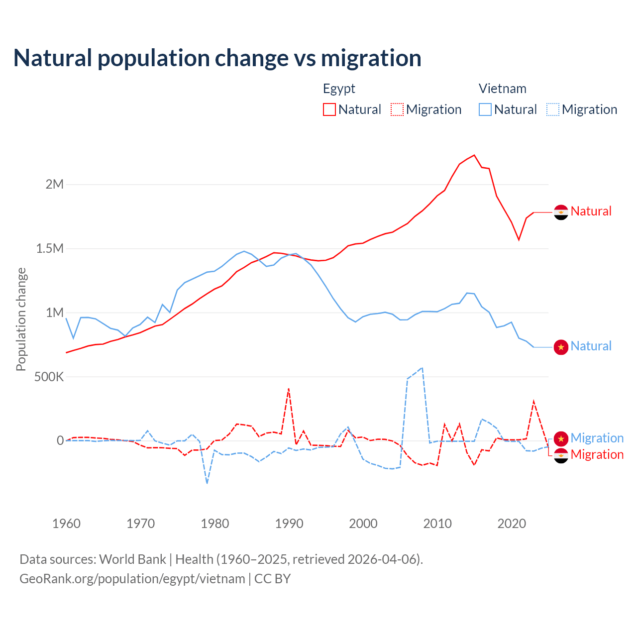 Over the last 10 years, 99.6% of the population change in Egypt is from natural causes (a gain of 19,180,073 people) and 0.41% is from migration (a loss of 78,975 people). In Vietnam 97.7% is from natural causes (a gain of 9,349,756 people) and 2.29% is from migration (a gain of 219,073 people).