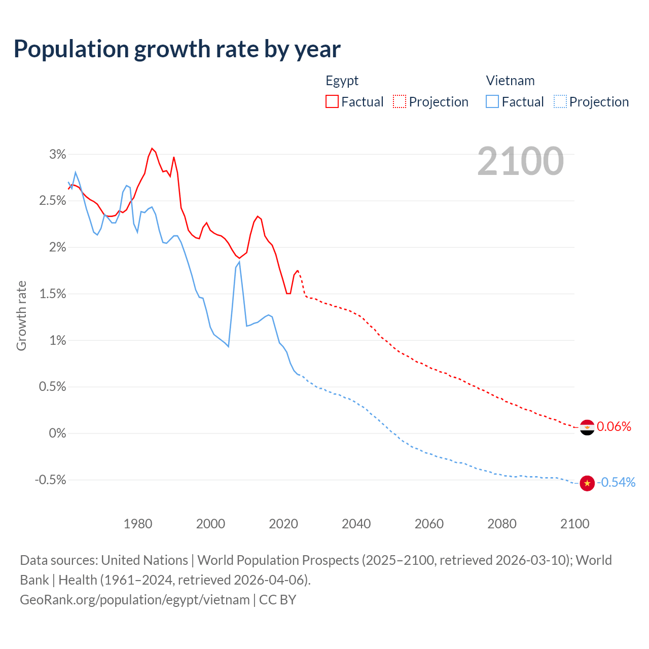 - For the last 10 years, Egypt has had an average growth rate of +1.84% per year vs +0.99% in Vietnam.