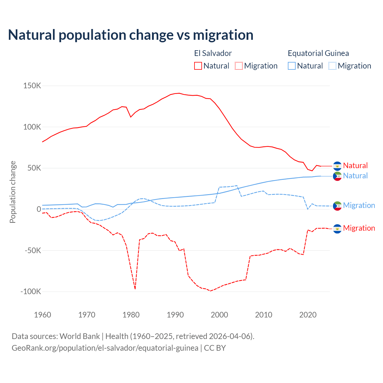 Over the last 10 years, 58.8% of the population change in El Salvador is from natural causes (a gain of 579,641 people) and 41.2% is from migration (a loss of 406,874 people). In Equatorial Guinea 77% is from natural causes (a gain of 382,745 people) and 23% is from migration (a gain of 114,024 people).