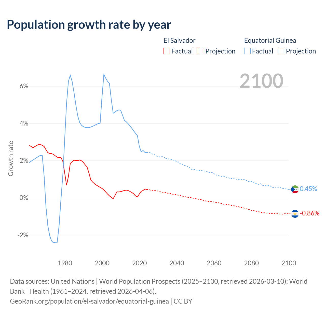 - For the last 10 years, El Salvador has had an average growth rate of +0.29% per year vs +3.15% in Equatorial Guinea.