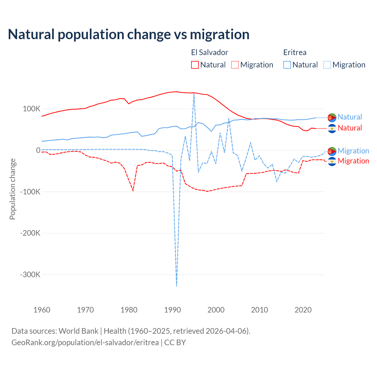 Over the last 10 years, 58.8% of the population change in El Salvador is from natural causes (a gain of 579,641 people) and 41.2% is from migration (a loss of 406,874 people). In Eritrea 68.8% is from natural causes (a gain of 742,837 people) and 31.2% is from migration (a loss of 336,243 people).