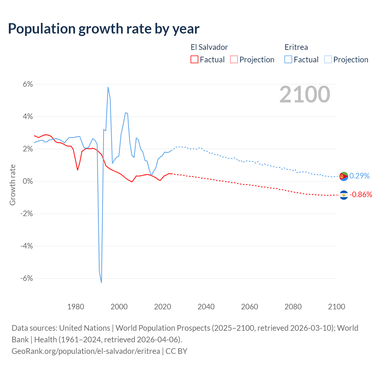 - For the last 10 years, El Salvador has had an average growth rate of +0.29% per year vs +1.28% in Eritrea.