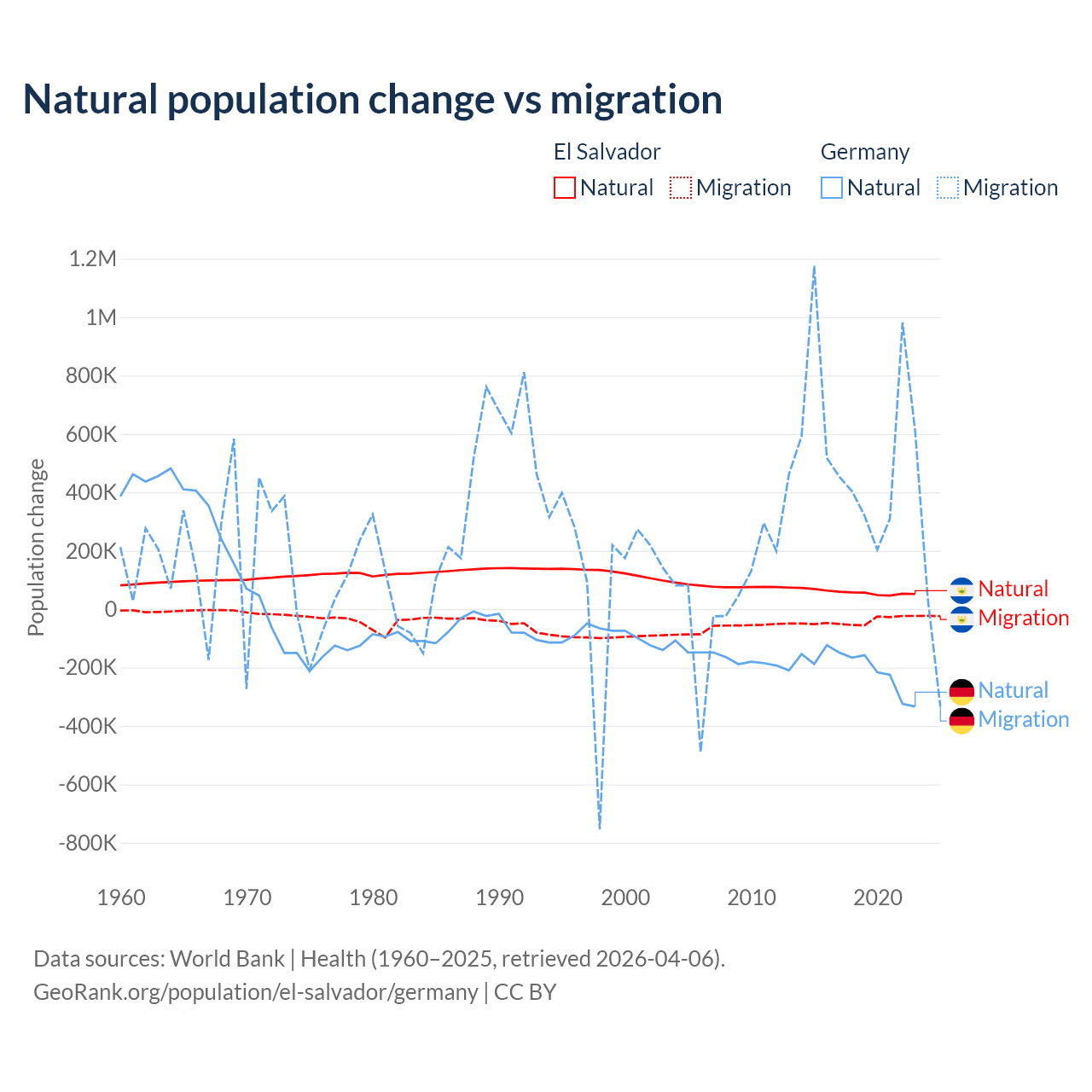 Over the last 10 years, 58.8% of the population change in El Salvador is from natural causes (a gain of 579,641 people) and 41.2% is from migration (a loss of 406,874 people). In Germany 26.8% is from natural causes (a loss of 2,036,130 people) and 73.2% is from migration (a gain of 5,565,916 people).