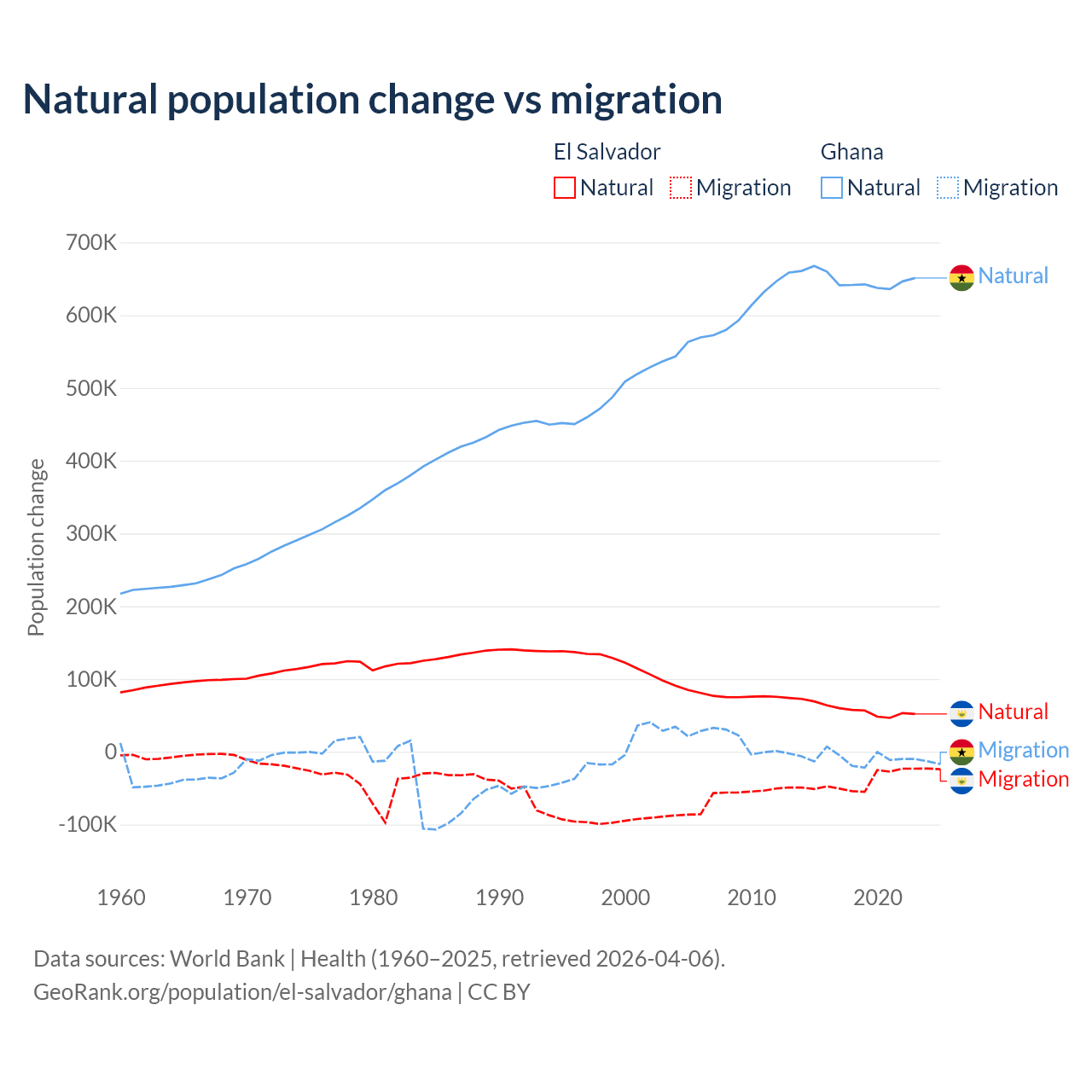 Over the last 10 years, 58.8% of the population change in El Salvador is from natural causes (a gain of 579,641 people) and 41.2% is from migration (a loss of 406,874 people). In Ghana 98.6% is from natural causes (a gain of 6,484,449 people) and 1.37% is from migration (a loss of 90,310 people).