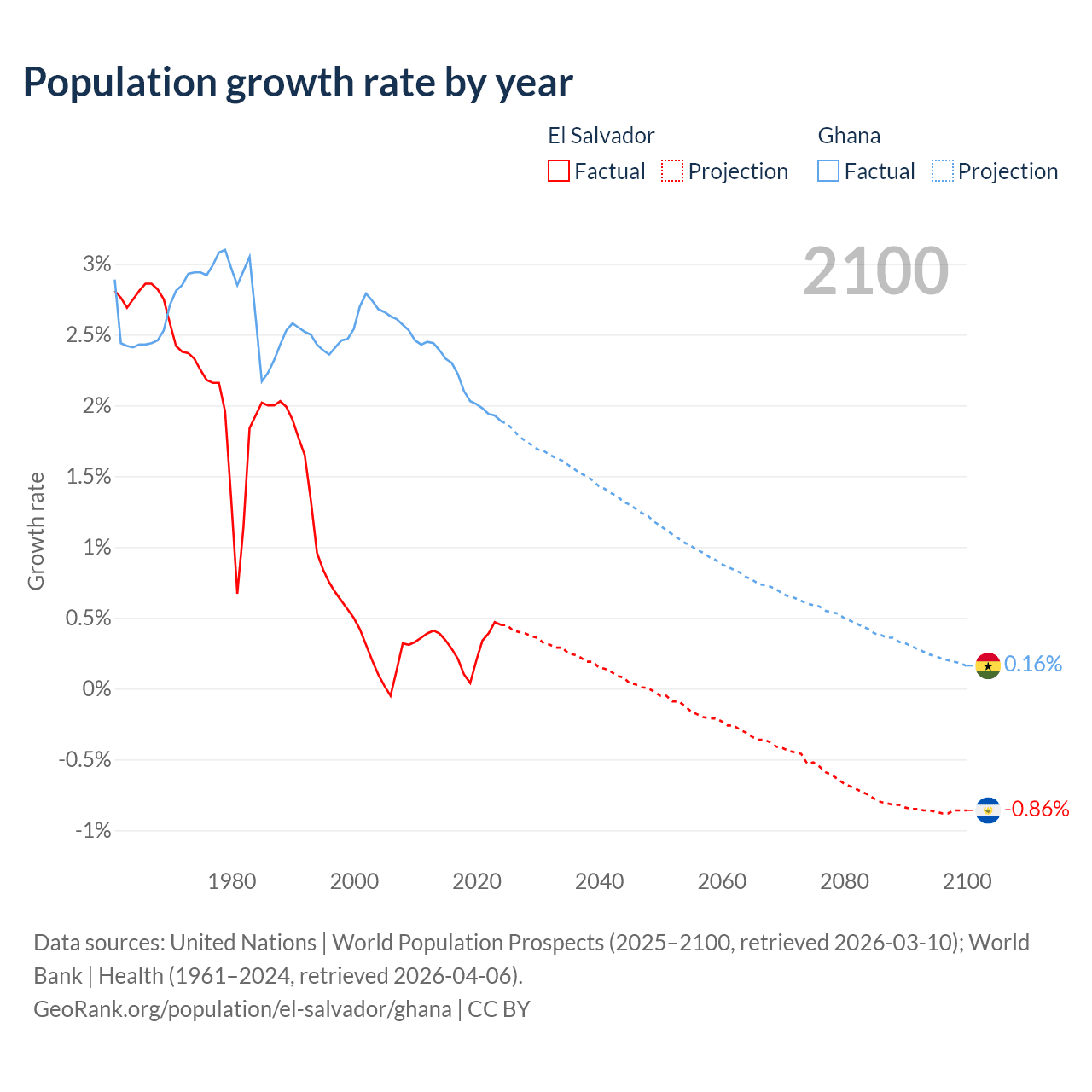 - For the last 10 years, El Salvador has had an average growth rate of +0.29% per year vs +2.1% in Ghana.