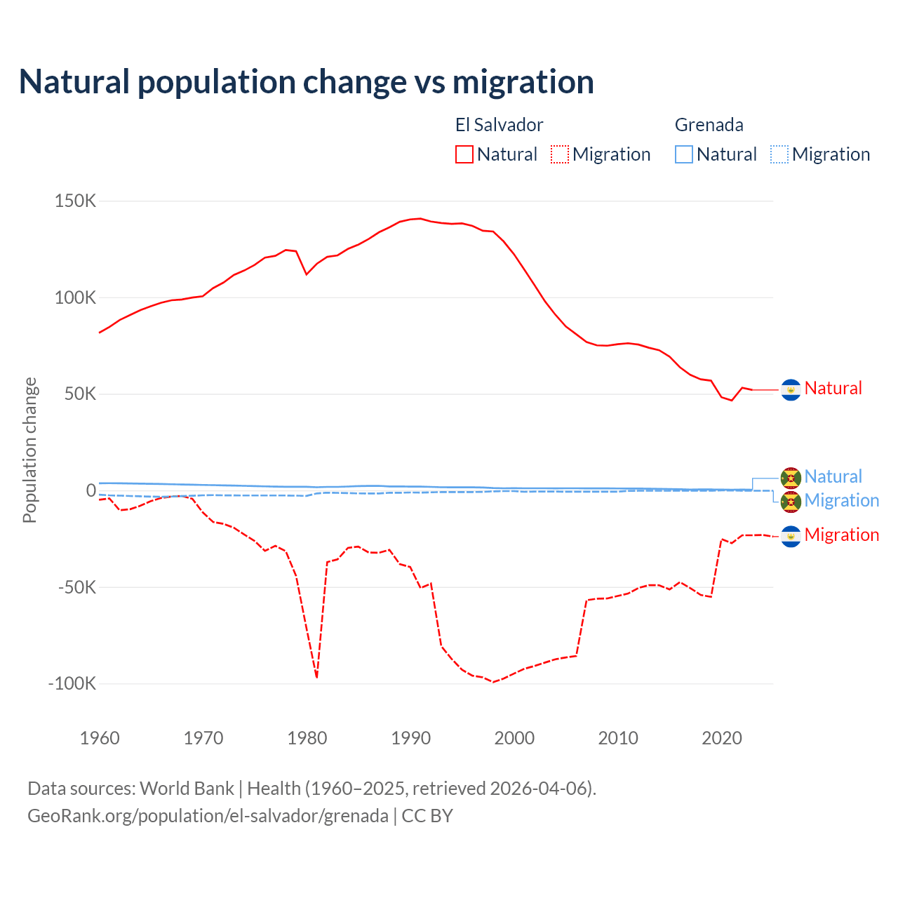 Over the last 10 years, 58.8% of the population change in El Salvador is from natural causes (a gain of 579,641 people) and 41.2% is from migration (a loss of 406,874 people). In Grenada 76% is from natural causes (a gain of 4,850 people) and 24% is from migration (a loss of 1,535 people).