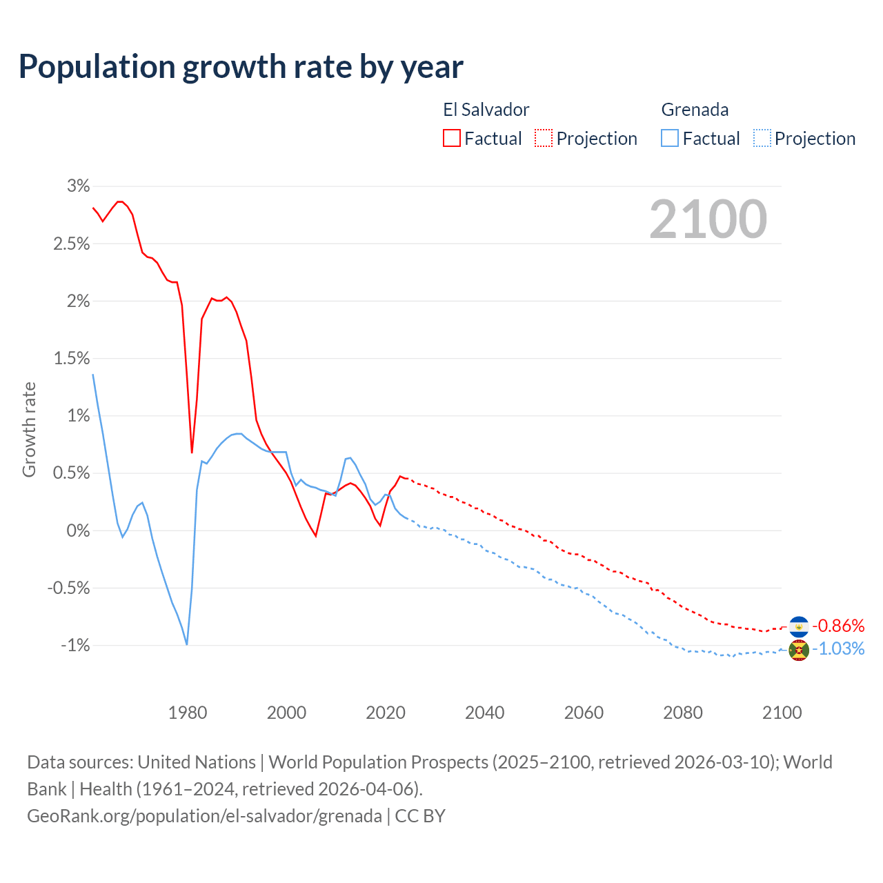 - For the last 10 years, El Salvador has had an average growth rate of +0.29% per year vs +0.29% in Grenada.