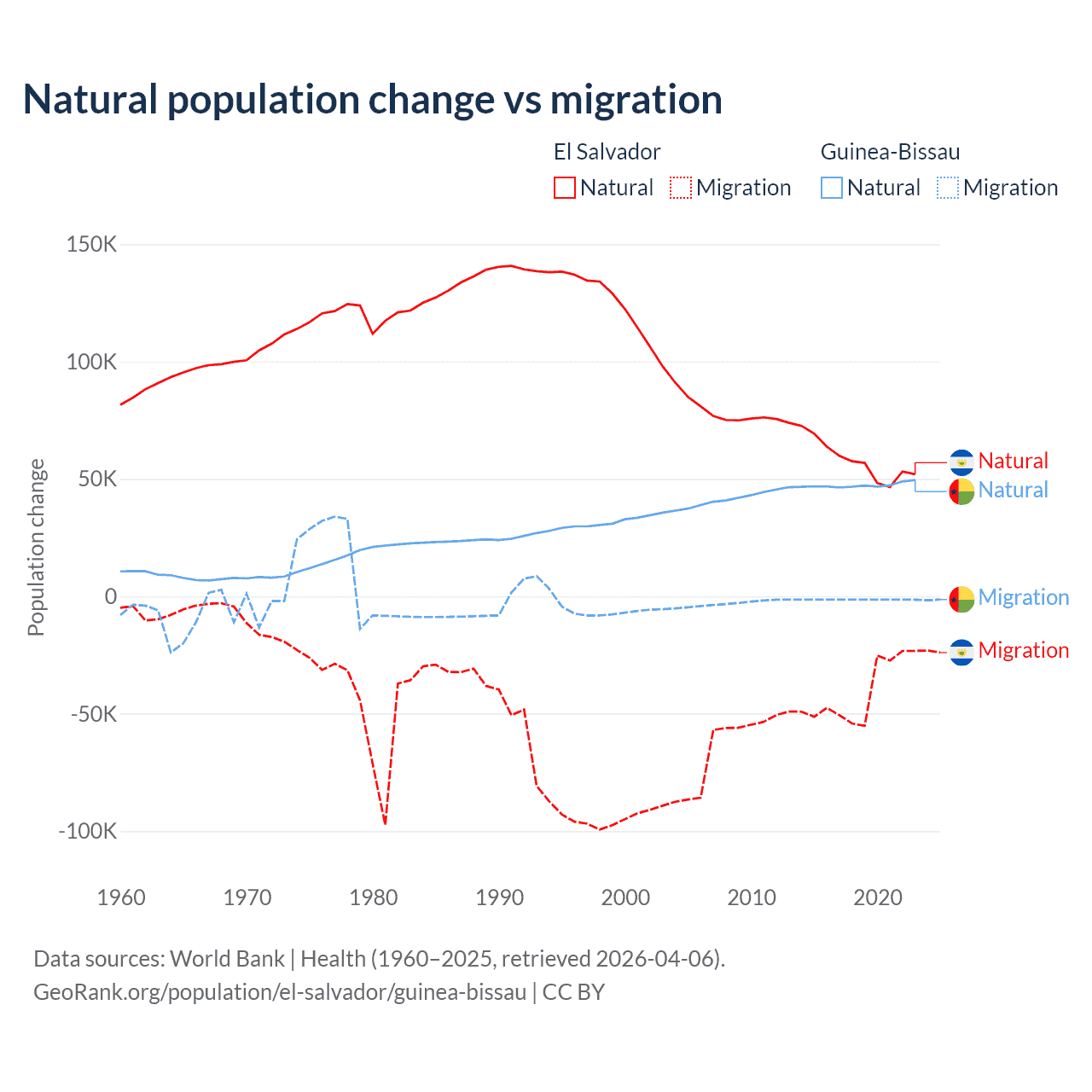 Over the last 10 years, 58.8% of the population change in El Salvador is from natural causes (a gain of 579,641 people) and 41.2% is from migration (a loss of 406,874 people). In Guinea-Bissau 97.1% is from natural causes (a gain of 472,826 people) and 2.87% is from migration (a loss of 13,956 people).