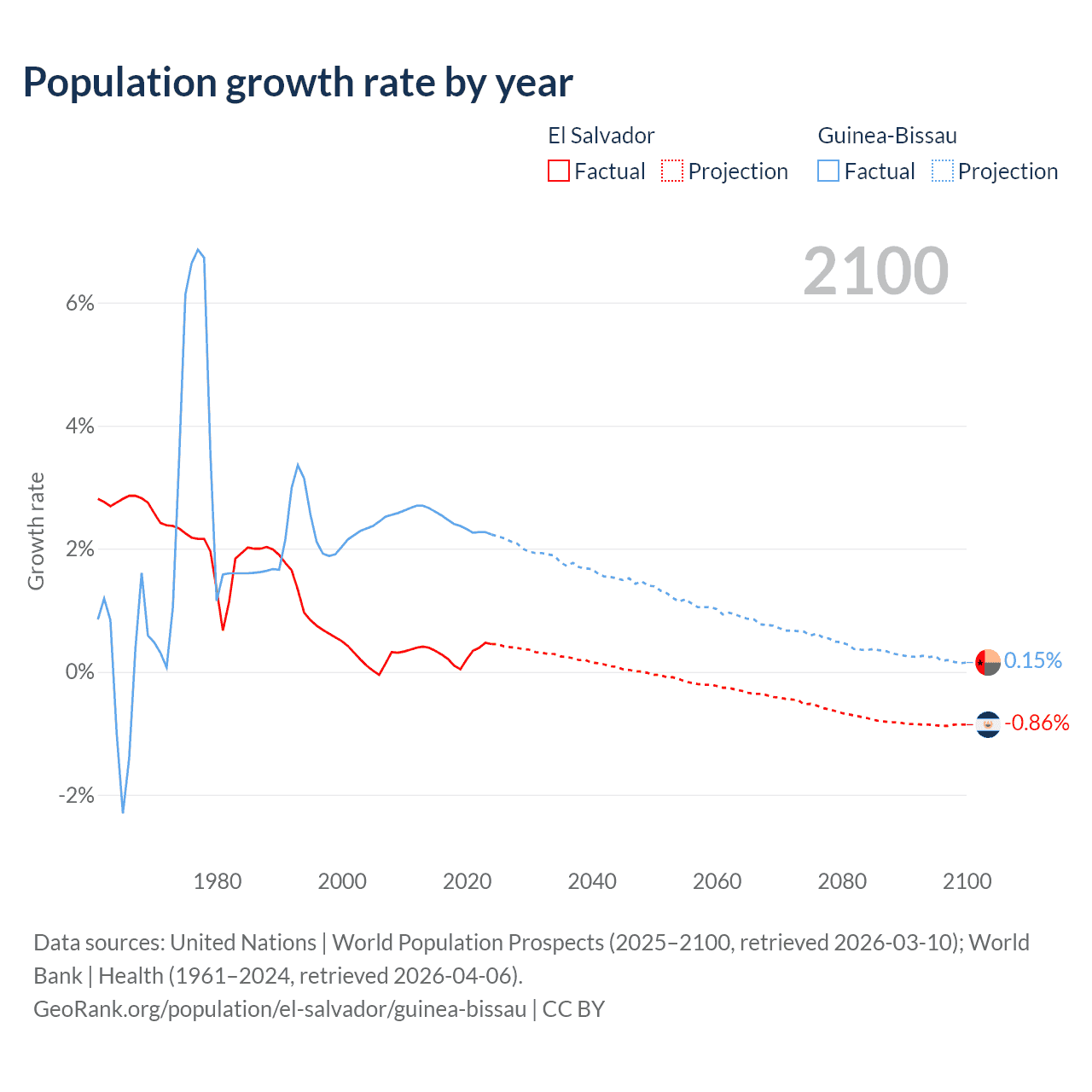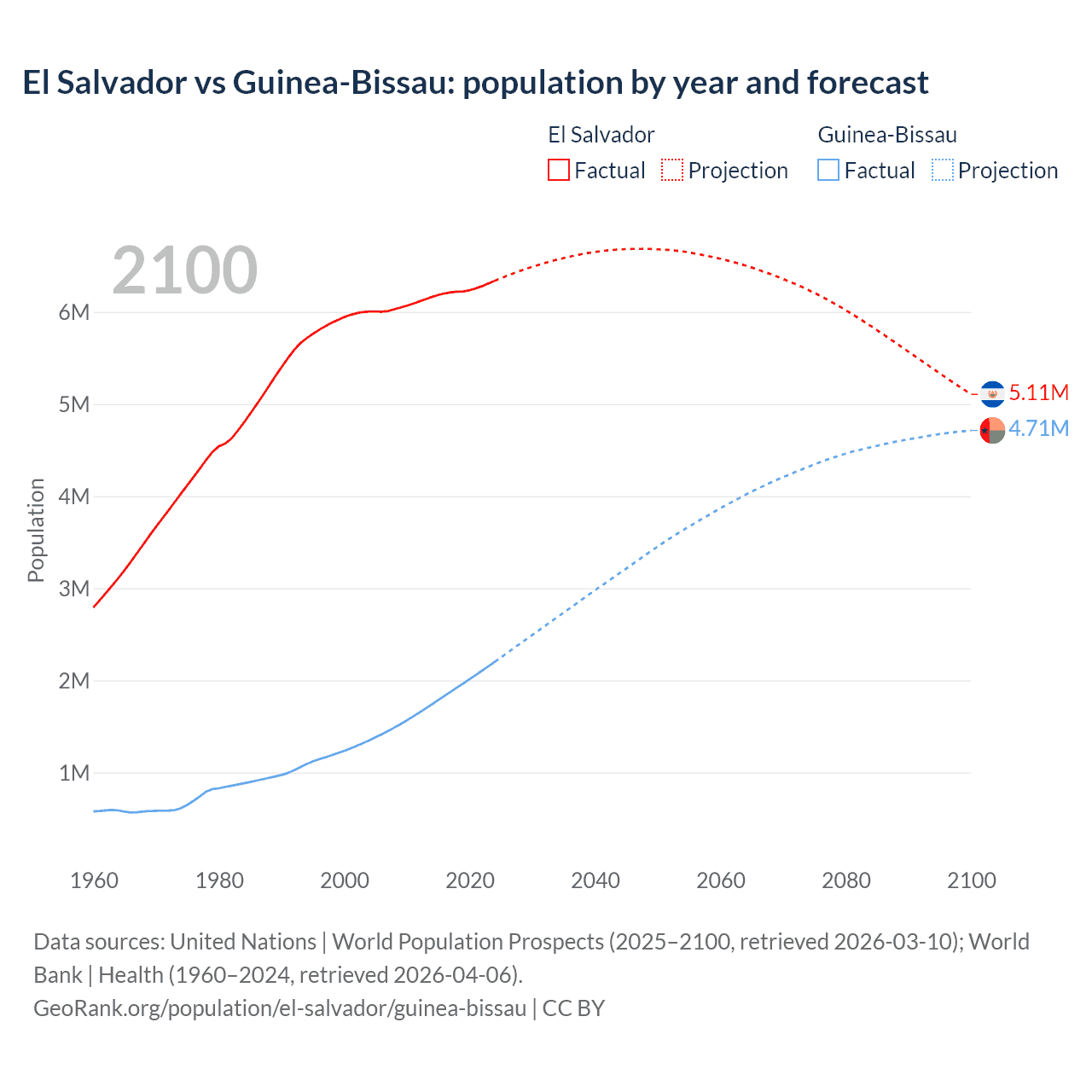 El Salvador vs Guinea-Bissau: population by year and forecast
