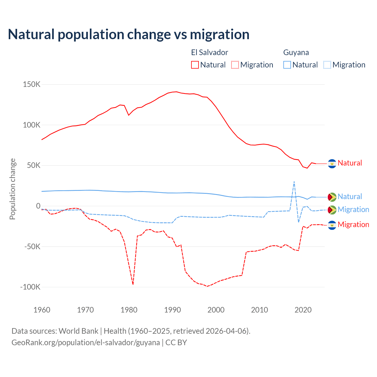 Over the last 10 years, 58.8% of the population change in El Salvador is from natural causes (a gain of 579,641 people) and 41.2% is from migration (a loss of 406,874 people). In Guyana 77.7% is from natural causes (a gain of 107,419 people) and 22.3% is from migration (a loss of 30,797 people).