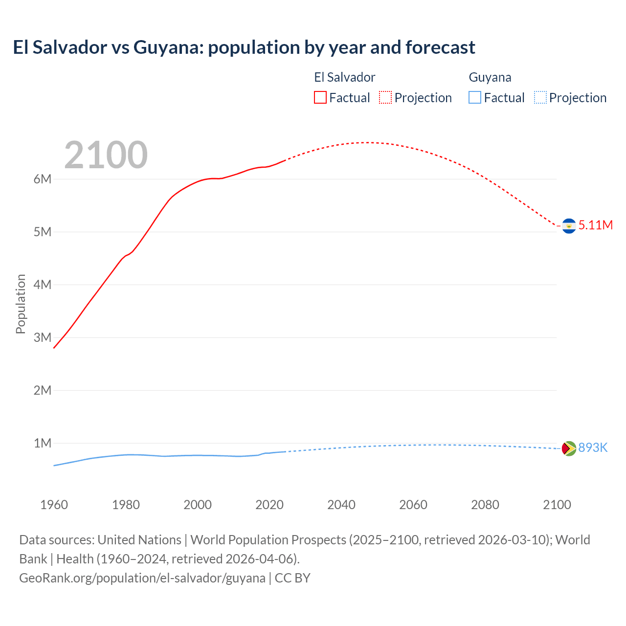 The latest officially reported population of El Salvador was 6,338,193 in 2024 vs 831,087 people in Guyana in 2024. In 2026, based on the adjusted UN estimation, the current El Salvador's population is 6,399,793 people compared to 842,249 in Guyana.