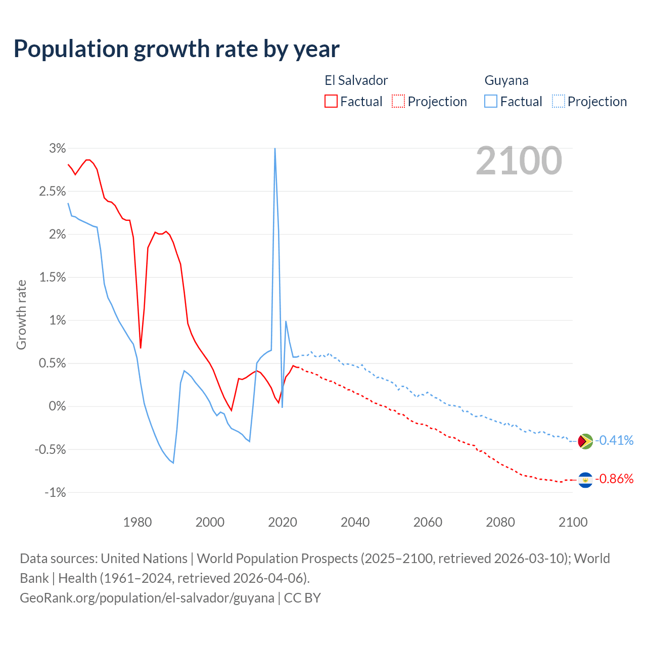 - For the last 10 years, El Salvador has had an average growth rate of +0.29% per year vs +0.94% in Guyana.